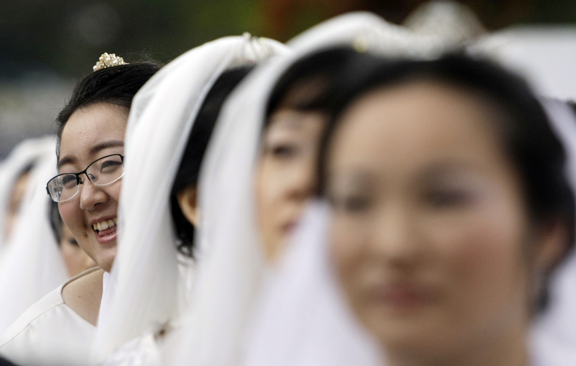A bride smiles during the mass wedding ceremony arranged by the Rev. Sun Myung Moon’s Unification Church at Sun Moon University in Asan, south of Seoul, South Korea, Wednesday. Brides in white gowns and Japanese kimonos joined grooms in black suits and red ties Wednesday for the Unification Church’s biggest mass wedding in a decade, a spectacle church officials say involves 40,000 people around the world. You write the cutline. (AP Photo/ Lee Jin-man)