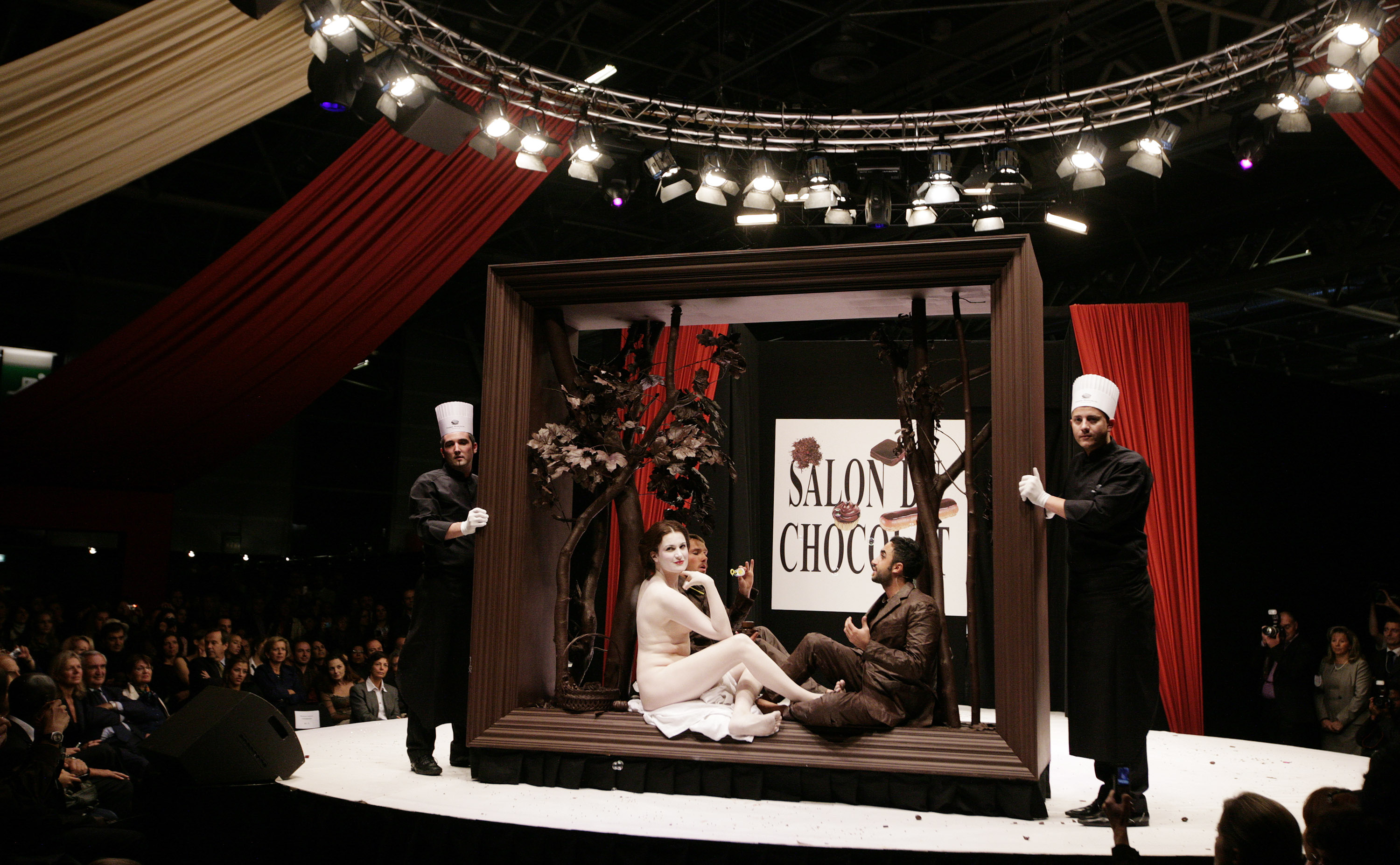 French actress Armelle Lesniak poses in a life-size chocolate painting composition based on Edouard Manet’s Le dejeuner sur L’Herbe (Luncheon on the Grass.) designed by Charles Kaisin and made with the help of French chocolate maker Pierre Marcolini, presented in Paris at the 15th World Chocolate fair. (AP Photo/jacques Brinon)