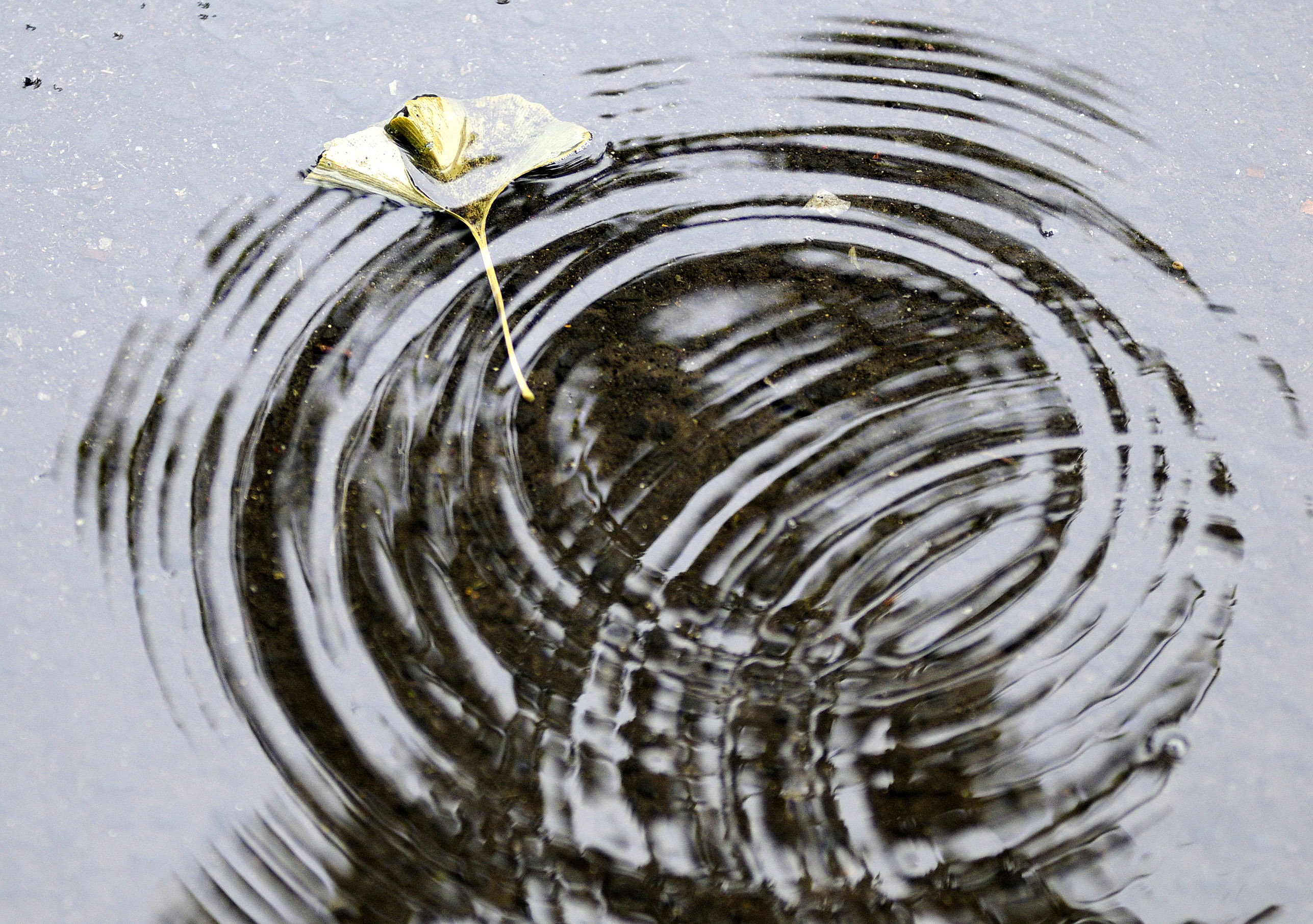 Raindrops cause a ripple in a puddle on path near the Red Wagon in Riverfront Park Wednesday in Spokane. (Dan Pelle/SR)
