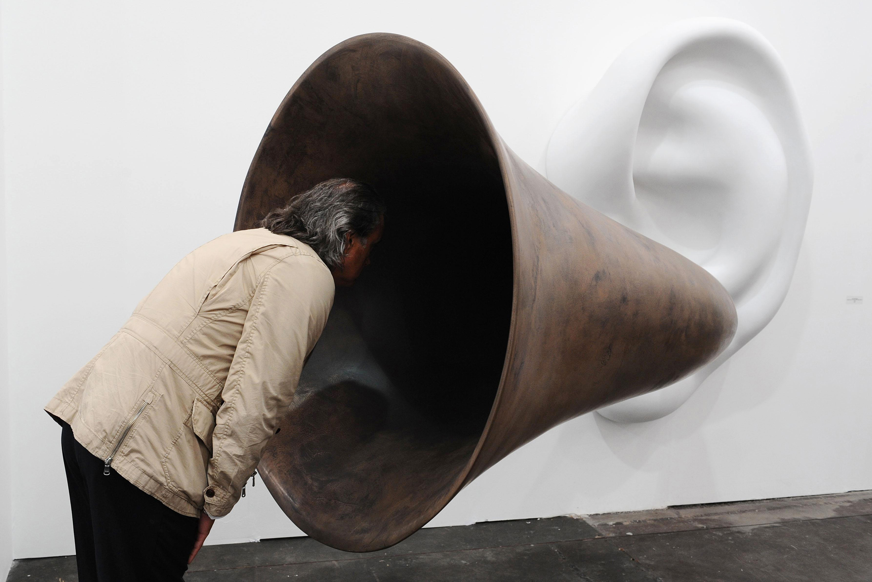 A visitor talks a close look at John Baldessari’s ‘Beethovens Trumpet (with ear) Opus’, which was displayed at The Frieze Art Fair in Regents Park, London, Wednesday. The British capital’s cutting-edge art sale kicks off today. You write the cutline. (AP Photo/Ian West, PA)