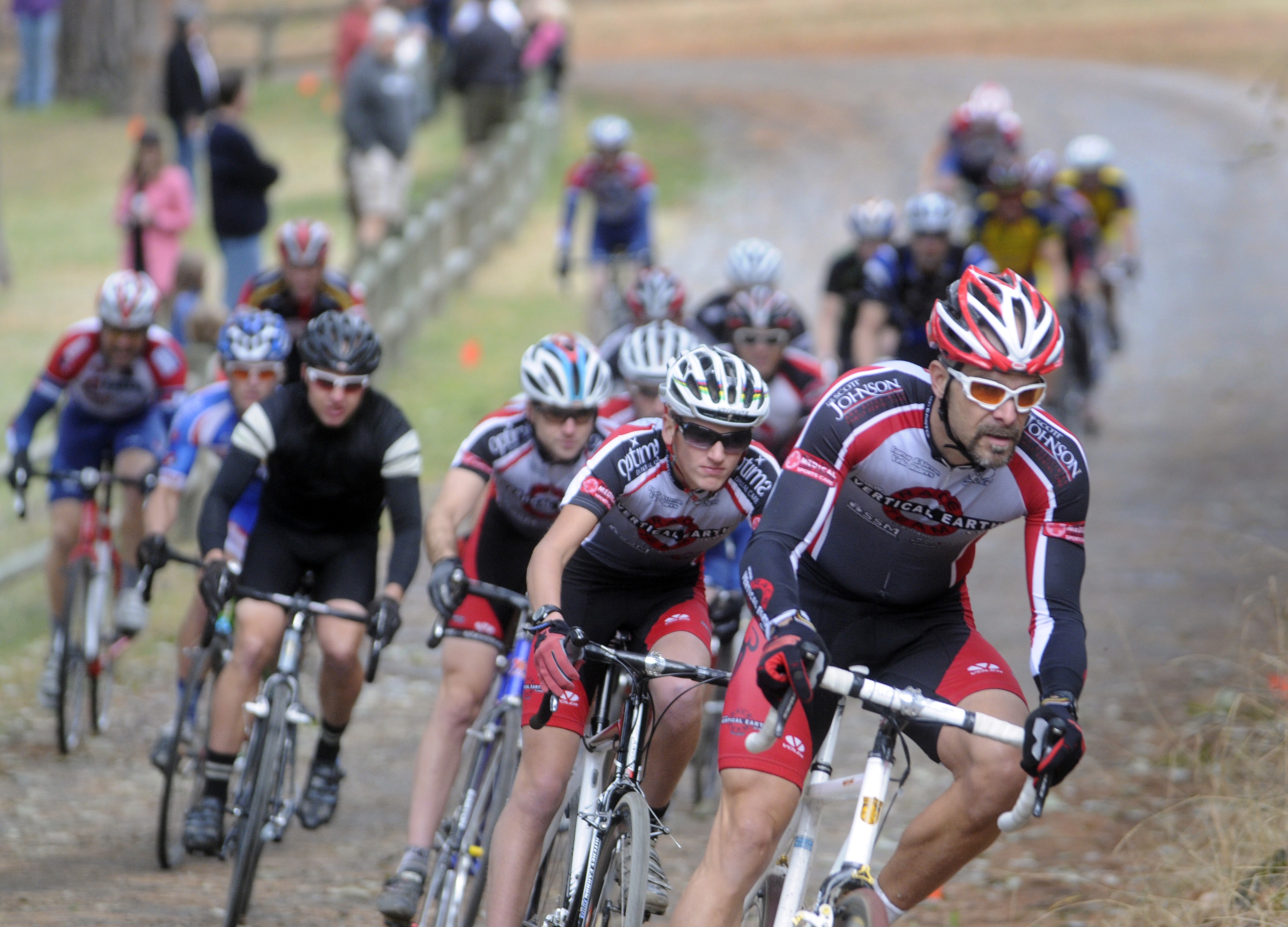Cyclocross riders from the Vertical Earth team in Coeur d’alene lead the pack of riders at the beginning of the Men A Category start during the 2009 Inland Northwest Cyclocross Series race at Liberty Lake County Park on Sunday. Cyclocross is a form of bicycle racing which consists of many laps on a short course featuring pavement, wooded trails, grass, steep hills and obstacles which require the ride to quickly dismount, carry their bike while navigating the obstruction and then remounting. (J. Bart Rayniak/SR)