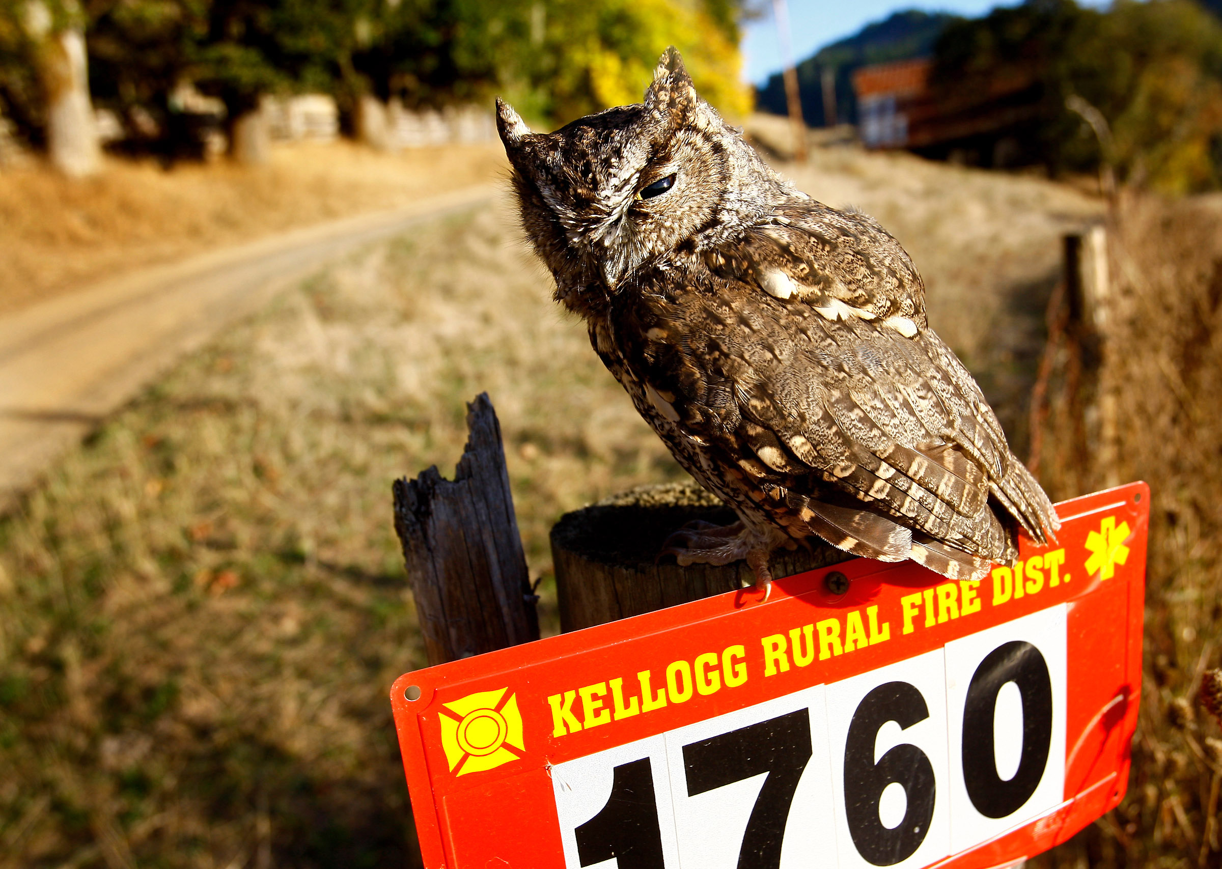 In this recent photo, a western screech-owl sits on a fence post along a country road near Kellogg, Ore. (AP Photo/The News-Review, Robin Loznak)