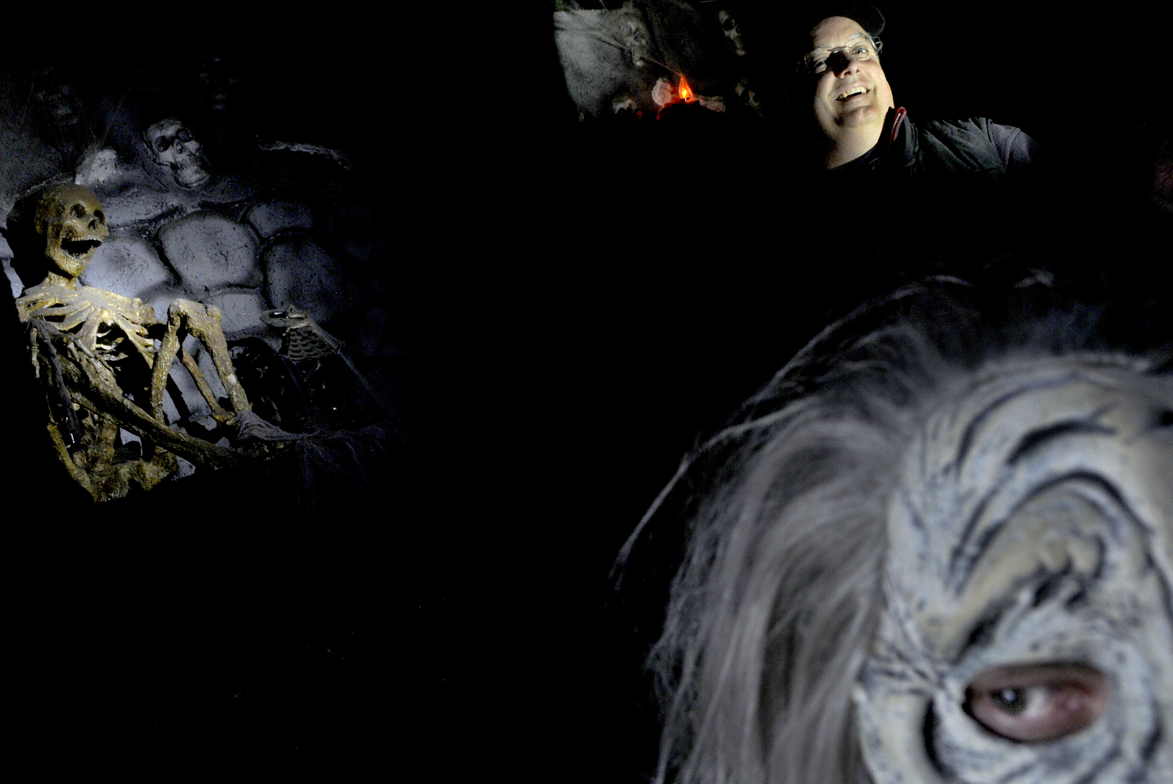 Post Falls Lions Club members Rich Houser, top and Mike Jarrett, wearing the mask posed for pictures at the Lions Club Haunted House in Post Falls recently. Now in its 36th year, the club is gearing up for their annual fundraiser. Jacob Livingston’s story here . (Kathy Plonka/SR photo)