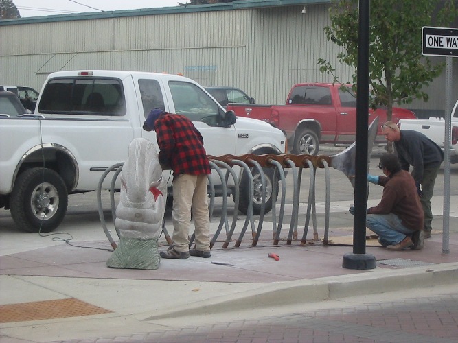 City workers install a new bicycle rack in the Midtown area as part of the 4th Street renovation project. The racks were designed by artist Tyree Kerns in conjunction with the city’s Arts Commission.