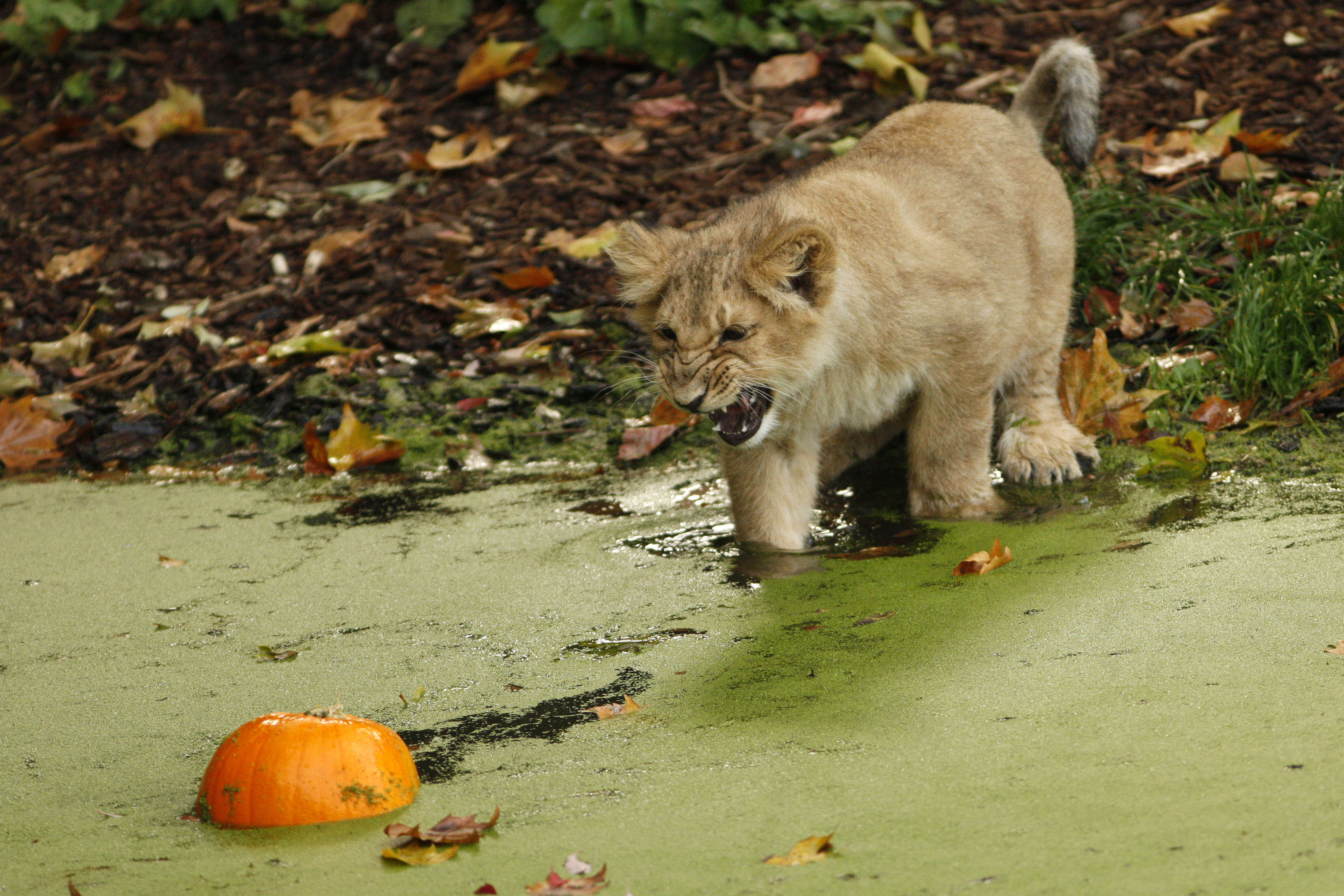 Three-month-old Asian lion cub, Rubi, attempts to retrieve a pumpkin which fell into the pond in the lions enclosure at the London Zoo in London on Thursday. You write the cutline. (AP Photo/Sang Tan)