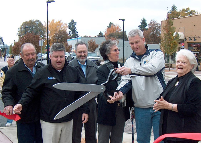 Mayor and Council, LCDC board members, contractors, business owners, artists, and others gathered today for a ribbon cutting to mark the completion of the Midtown Improvement project. Mayor Bloem thanked everyone involved for keeping the project on schedule and below budget, with a special thanks to the business owners for their patience. Among the participants were (from left): Ron Edinger, Mike Kennedy, Al Hassell, Sandi Bloem, Kevin Stevens, and Deanna Goodlander.