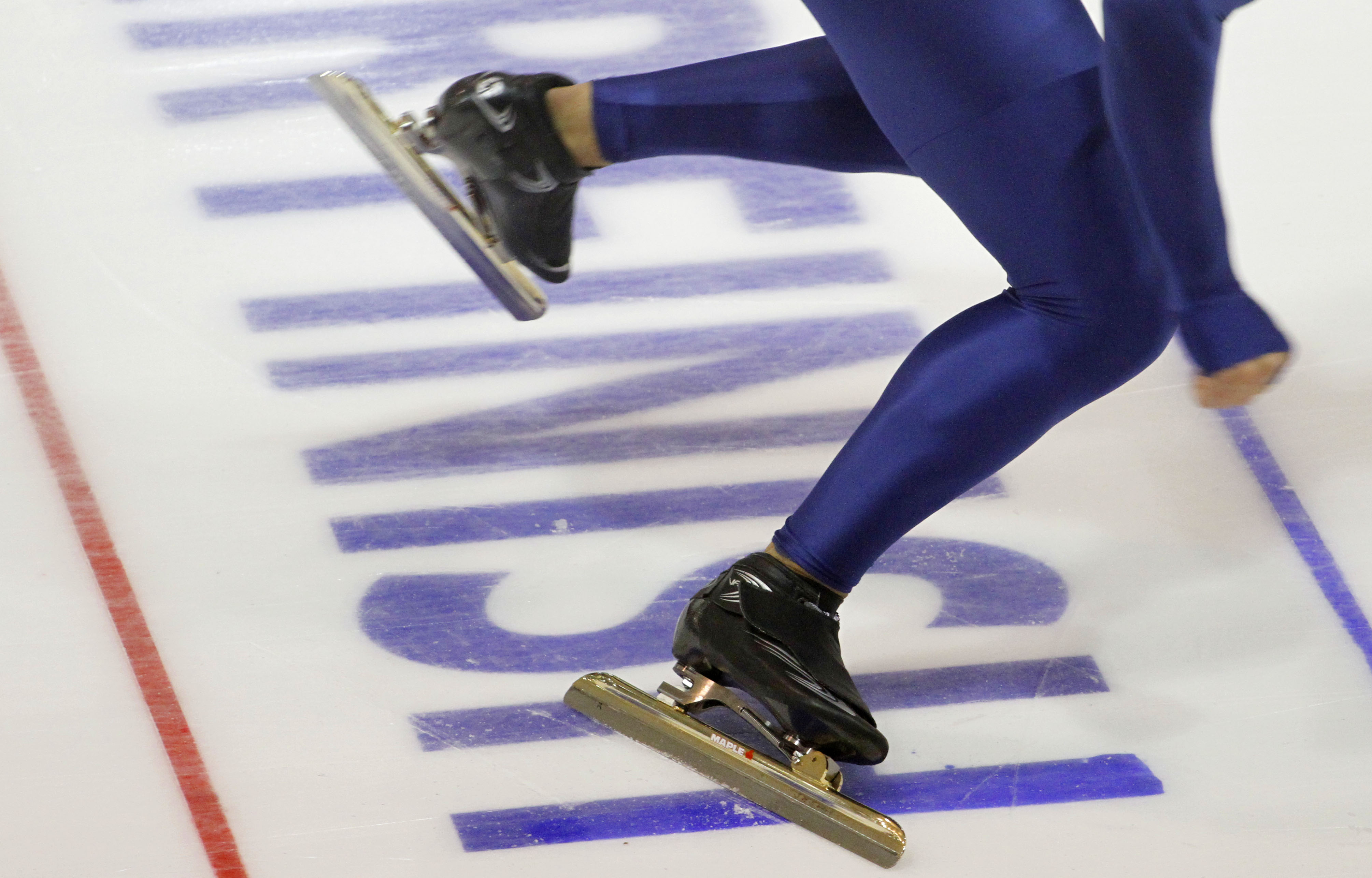 A skater practices his starts before the second day of the U.S. speedskating trials Thursday in West Allis, Wis. (AP Photo/Jeffrey Phelps)