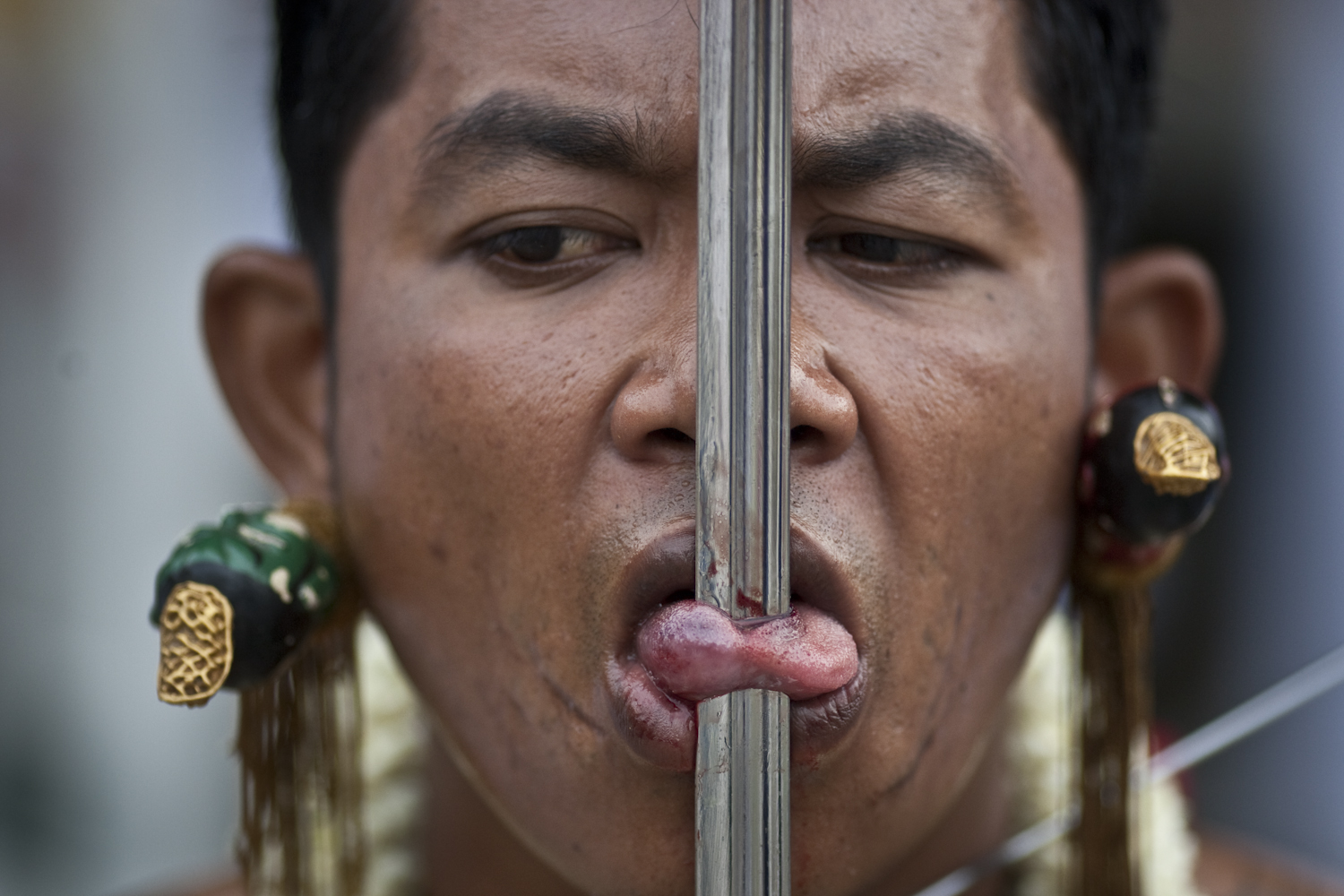 A devotees of the Jui Tui Chinese Shrine has his tongue pierced prior to a street procession at the Vegetarian Festival Saturday in Phuket, Thailand. The annual festival traces its origin back to the early 1800’s when Chinese tin miners and others who had been stricken with disease recovered by adhering to a strict vegetarian diet. (AP Photo/David Longstreath)