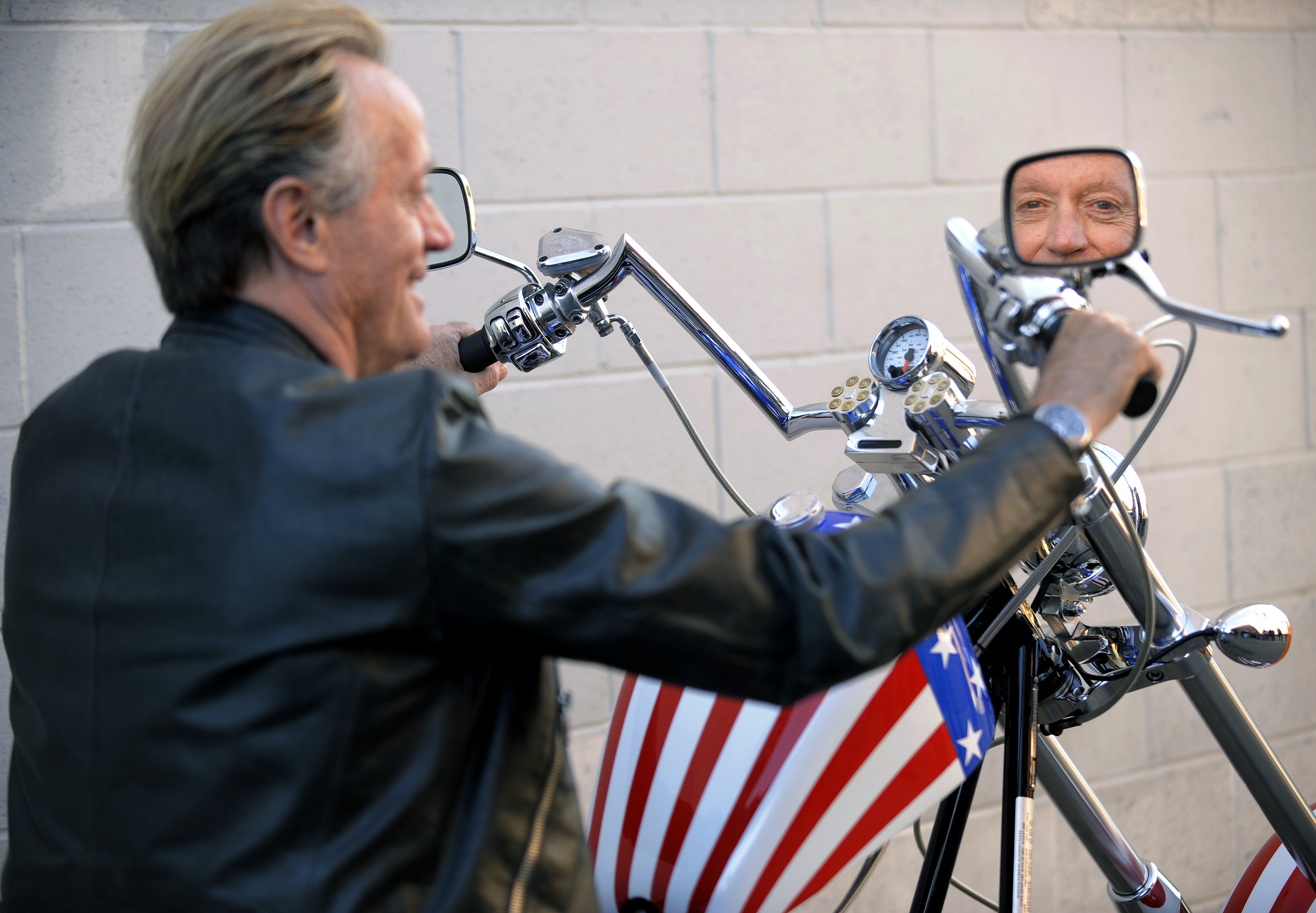 Peter Fonda, who played “Captain America” in the 1969 counterculture film “Easy Rider,” poses atop a Harley-Davidson motorcycle based on the one he rode in the film, Friday, in Glendale, Calif. Fonda was promoting the recent release of the film on Blu-ray disk, coinciding with the 40th anniversary of the film. (AP Photo/Chris Pizzello)