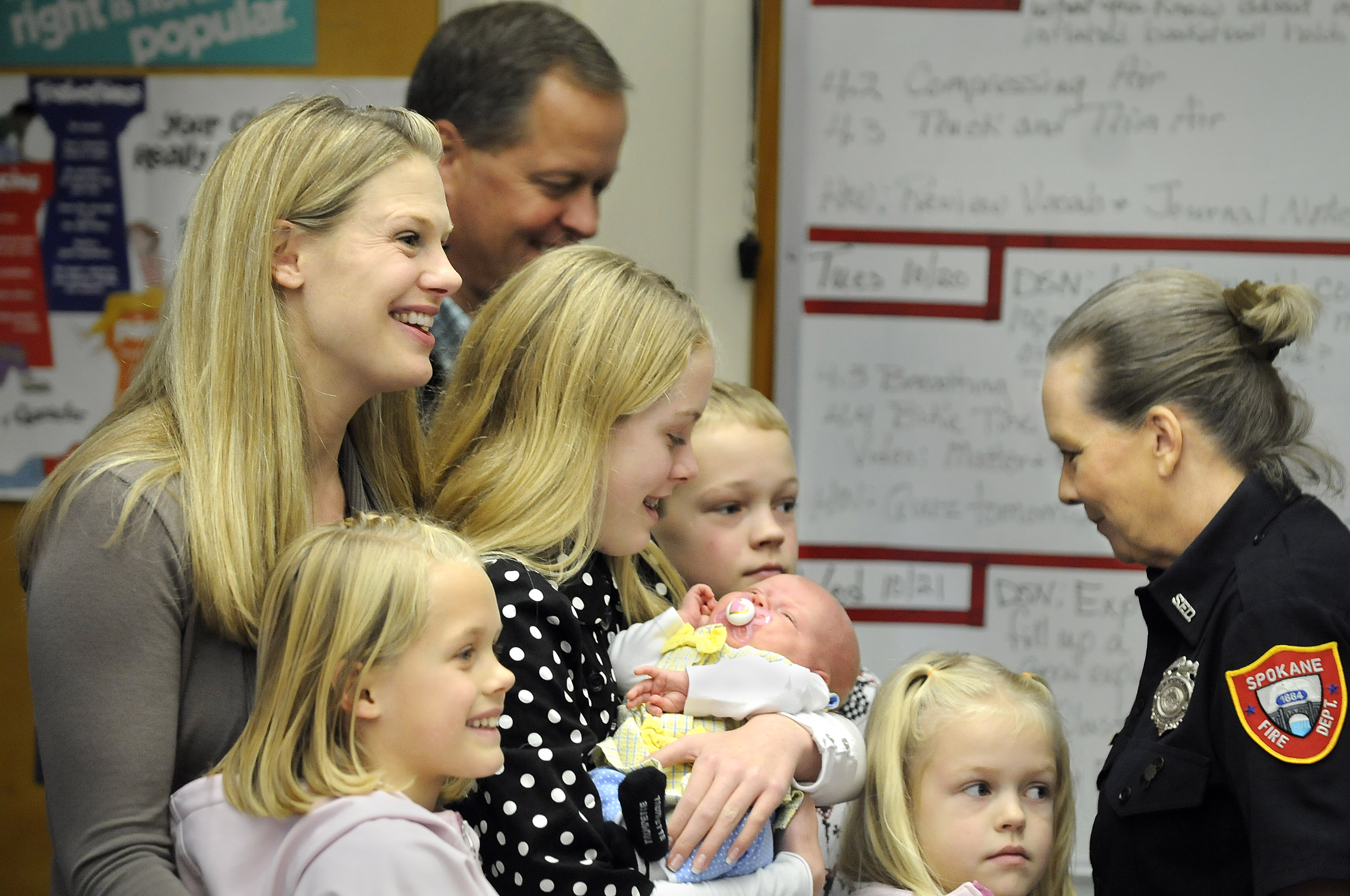 Emma Herb ( center in polka dots ) holds her newborn sister Hadley as her family gathers for a photo with Spokane FIre Department dispatcher Linda Hendrix ( far right ) Monday. The Fire Department came to Sacajawea Middle School to give Emma recognition for calling 911 and relaying instructions from Hendrix to the rest of the family when her mother Amanda ( far left ) went into delivery unexpectedly. (Christopher Anderson/SR)
