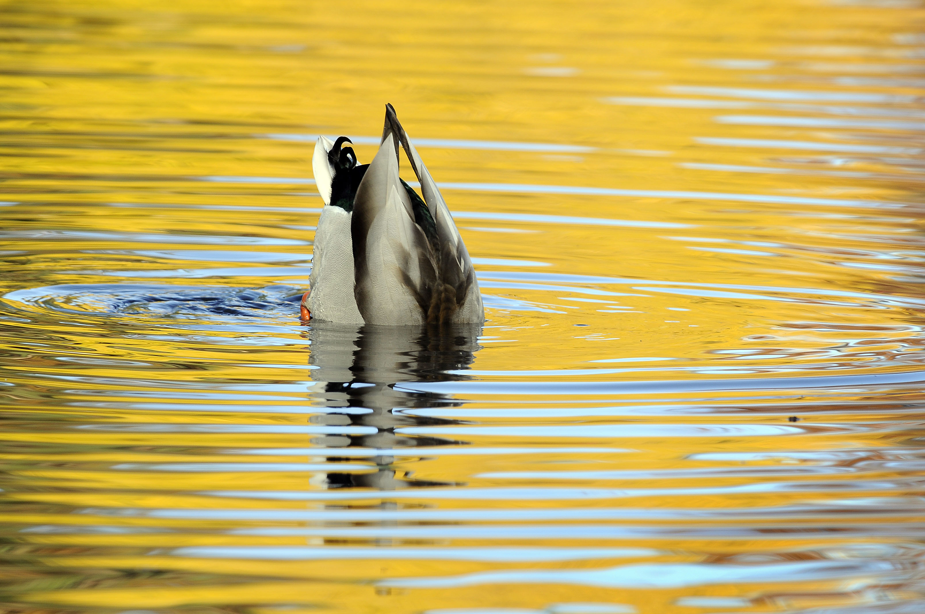 A duck dives for his his lunch while paddling around Cannon Hill pond in Spokane, Wa. The fall colors from trees surrounding the pond are reflecting in the water. (Dan Pelle/SR)