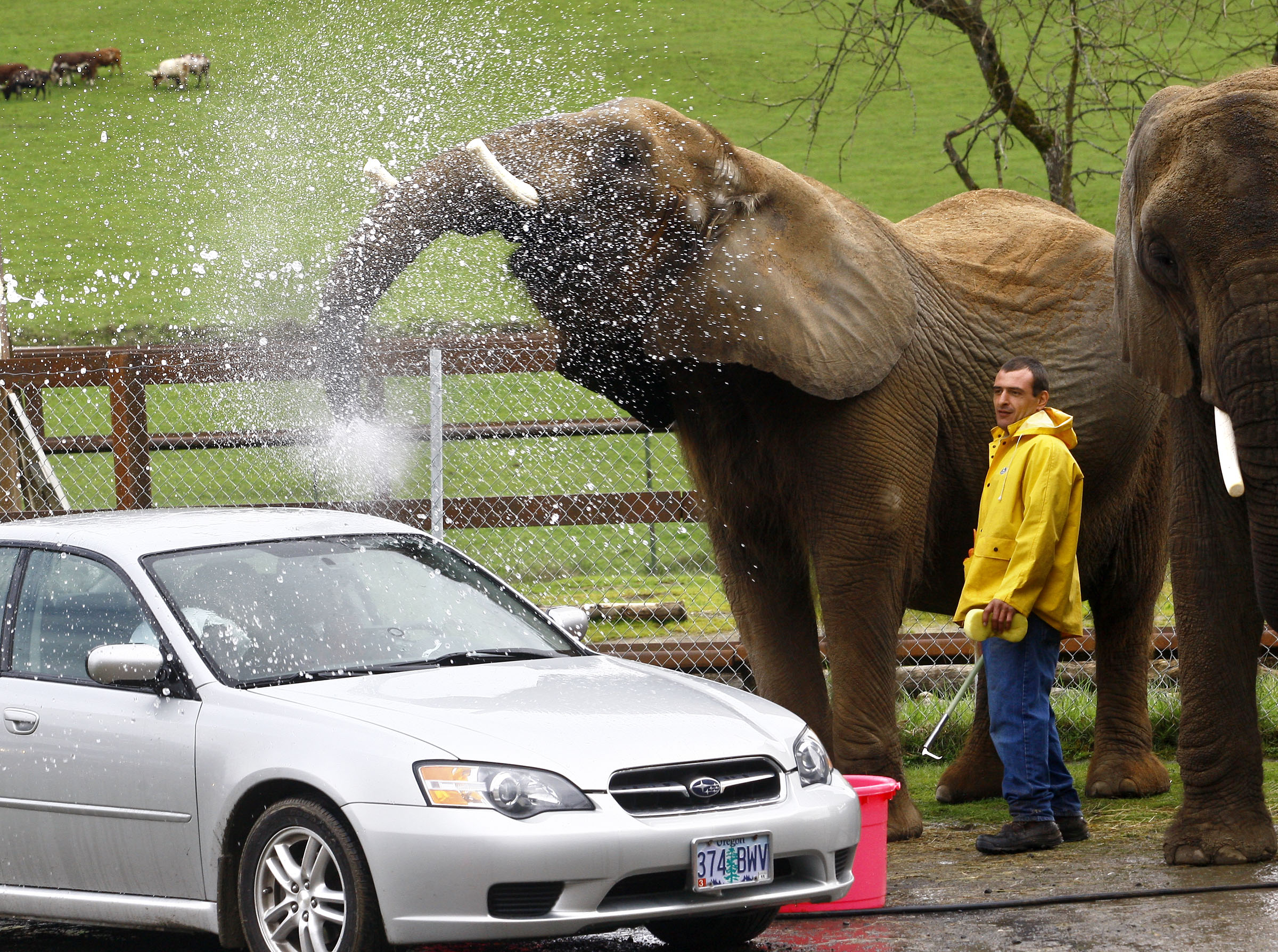This March 21, 2009, file photo shows elephants washing vehicles at Wildlife Safari in Winston, Ore., as trainer Timothy Hamilton holds a device called a bullhook. Representatives from People from the Ethical Treatment of Animals object to the use of the bullhooks, saying they force animals to act under the threat of pain. (AP Photo/The News-Review, Robin Loznak)