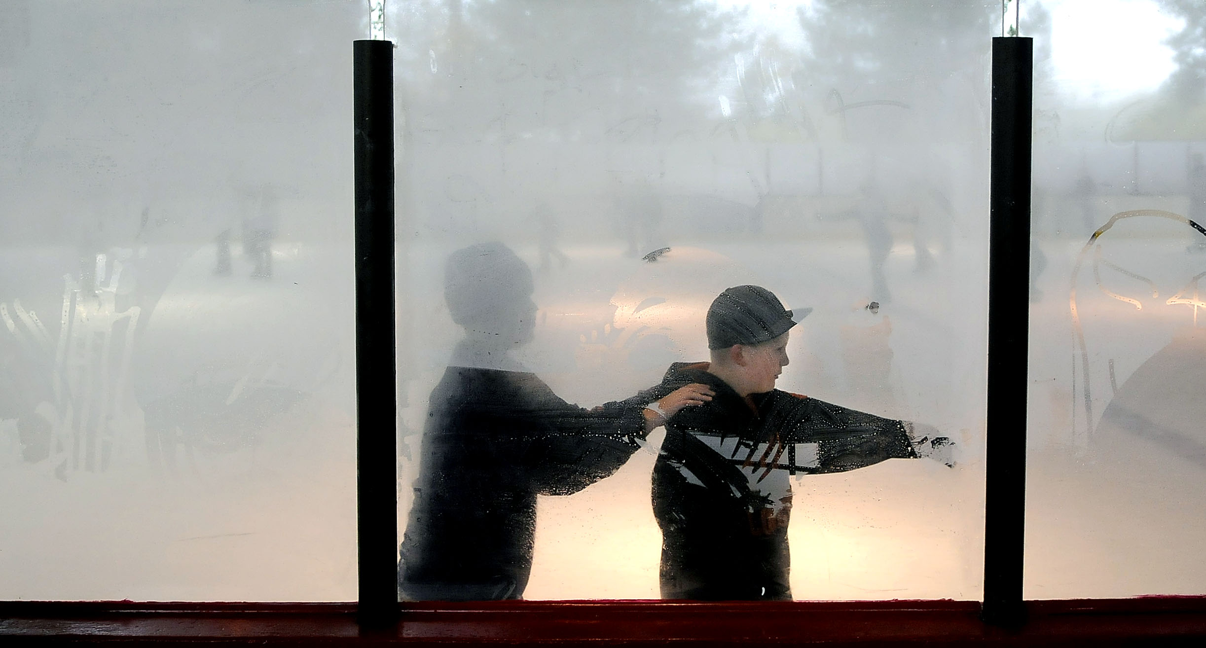 Collin Breckner (left) and Tristan Mulvey buddy up to make their way around the Riverfront Park Ice Palace in Spokane, Wa. Six-graders from Brentwood Elementary School, in the Mead district, decided to participate in a healthy activity instead of having a Halloween party at the school. (Dan Pelle/SR)