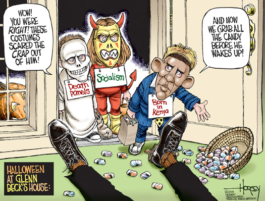 David Horsey takes a close look at what would happen if Barak Obama and some friends were to go trick-or-treating at Glenn Beck’s house with what some might observe to be predictable results. Of course this is only a cartoon. Can you imagine what would happen if the same intrepid trio were to visit Rush Limbaugh’s real-life house in costume?