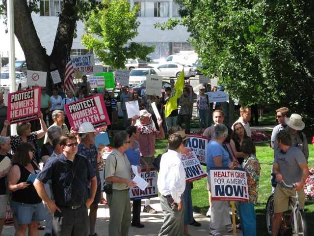 Wendy Somerset, owner of Furniture and Appliance Outlet in Twin Falls, said her employees won’t take the insurance she provides because of the cost: “It’s groceries or health insurance,” she said. “We need reform and we need it now.” As she spoke, flag-waving protesters in back yelled, “Take your socialism!” and “Read the Constitution!” and a woman shouted, “We’re not going to pay for your abortions!” When rally organizer Nancy Snodgrass of the Main Street Alliance appealed for quiet and respect from both sides, protester Lucille Verdolini shouted from the back, “Let’s pray that you don’t get breast cancer and die.” The group in back then chanted, “Obama lies, Grandma dies.”