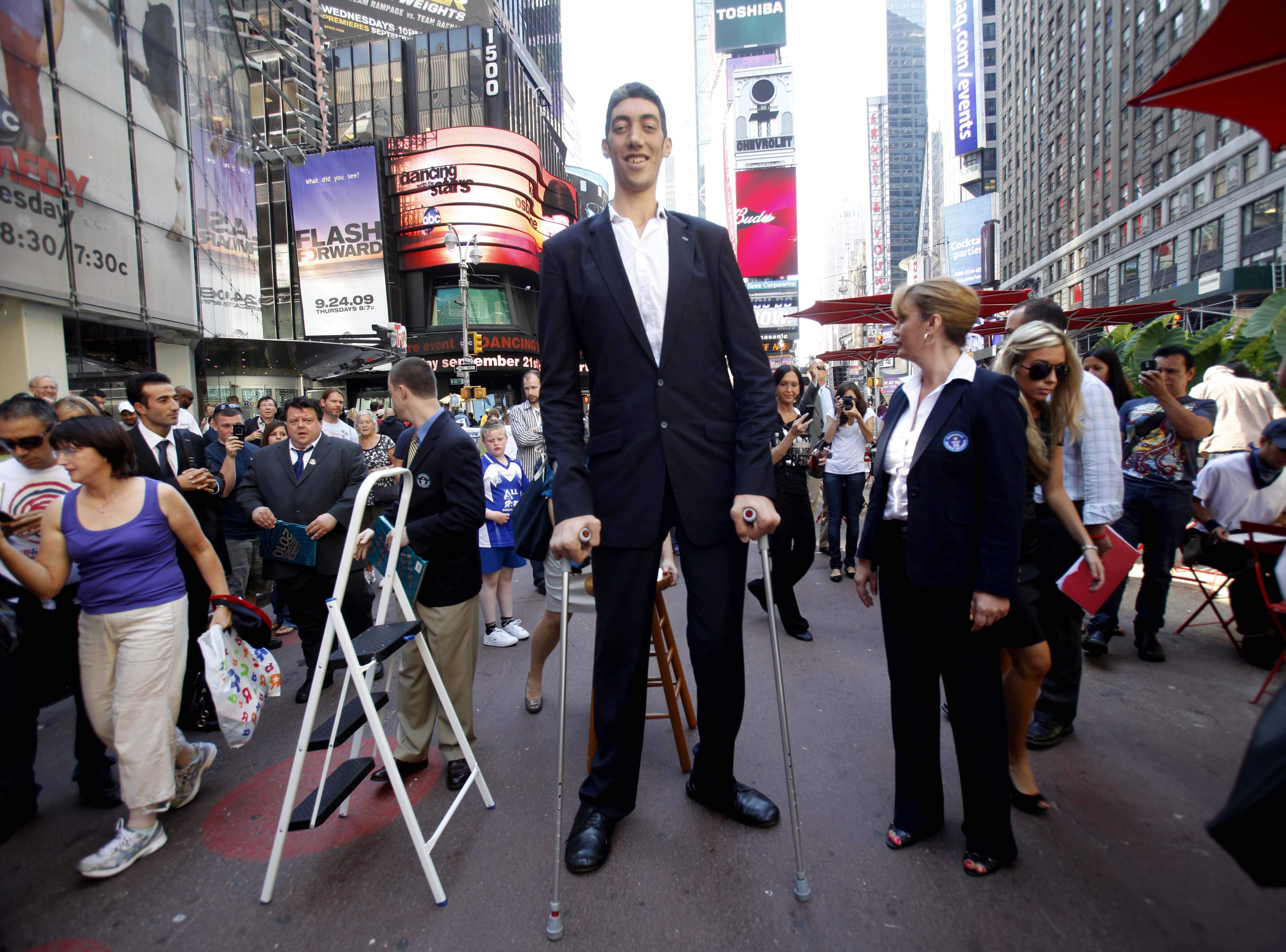 The world’s tallest man, Sultan Kosen of Turkey, poses in New York’s Times Square Monday. Kosen has been verified by the Guinness Book of World Records as the world’s tallest living man at 8 foot 1 inch. (AP Photo/Seth Wenig)