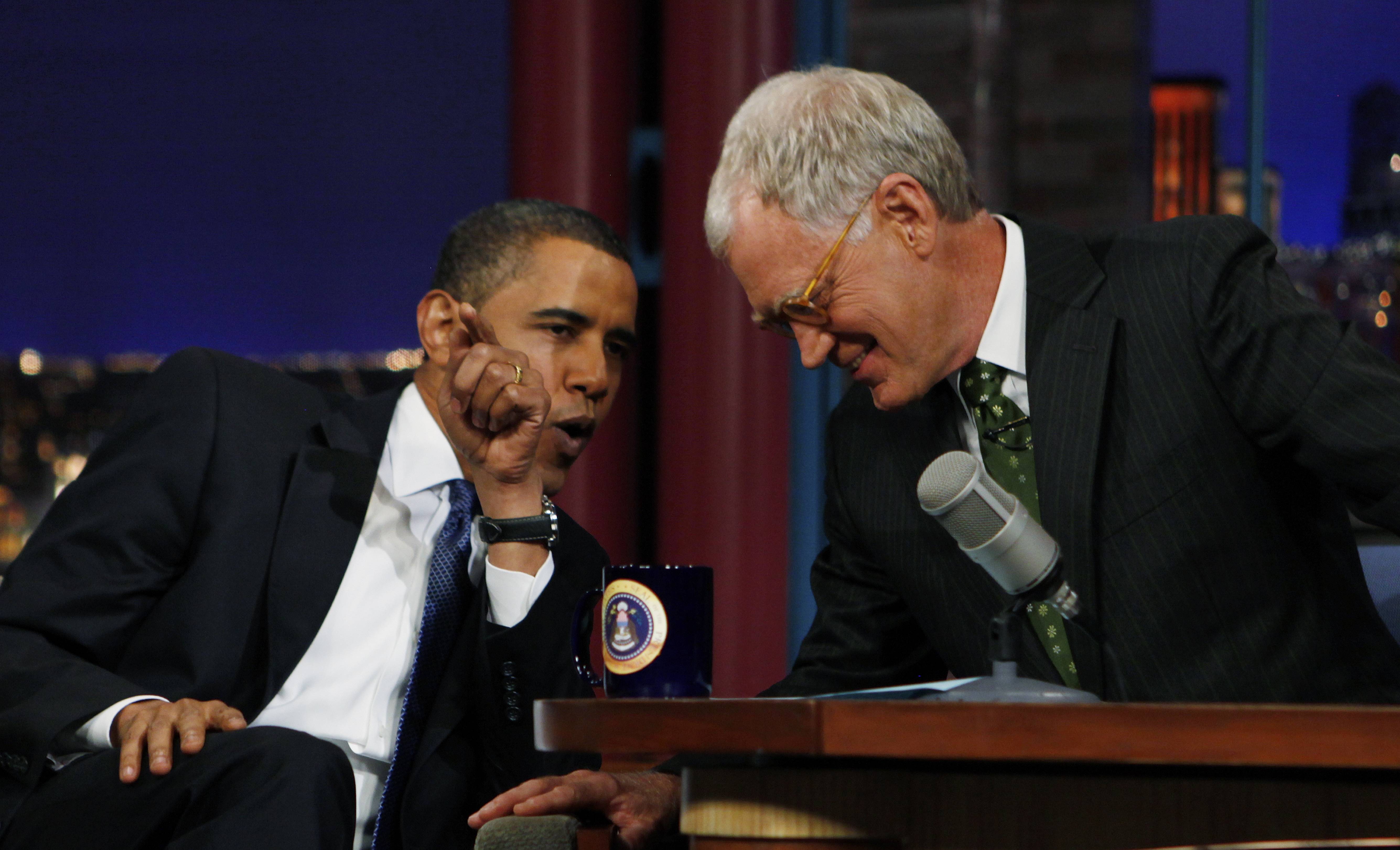 President Barack Obama is pictured with host David Letterman during a break at a taping of CBS The Late Show with David Letterman at the Ed Sullivan Theater in New York today. (AP Photo/Charles Dharapak)