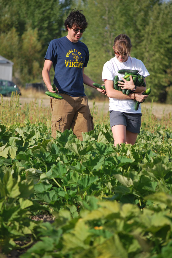 Dylan Hopkins and Katie Coyle, volunteers, harvest cucumbers on the Soil Stewards three-acre farm outside of Moscow Wednesday afternoon. Story here . (Sebastian Edgerton/Argonaut).