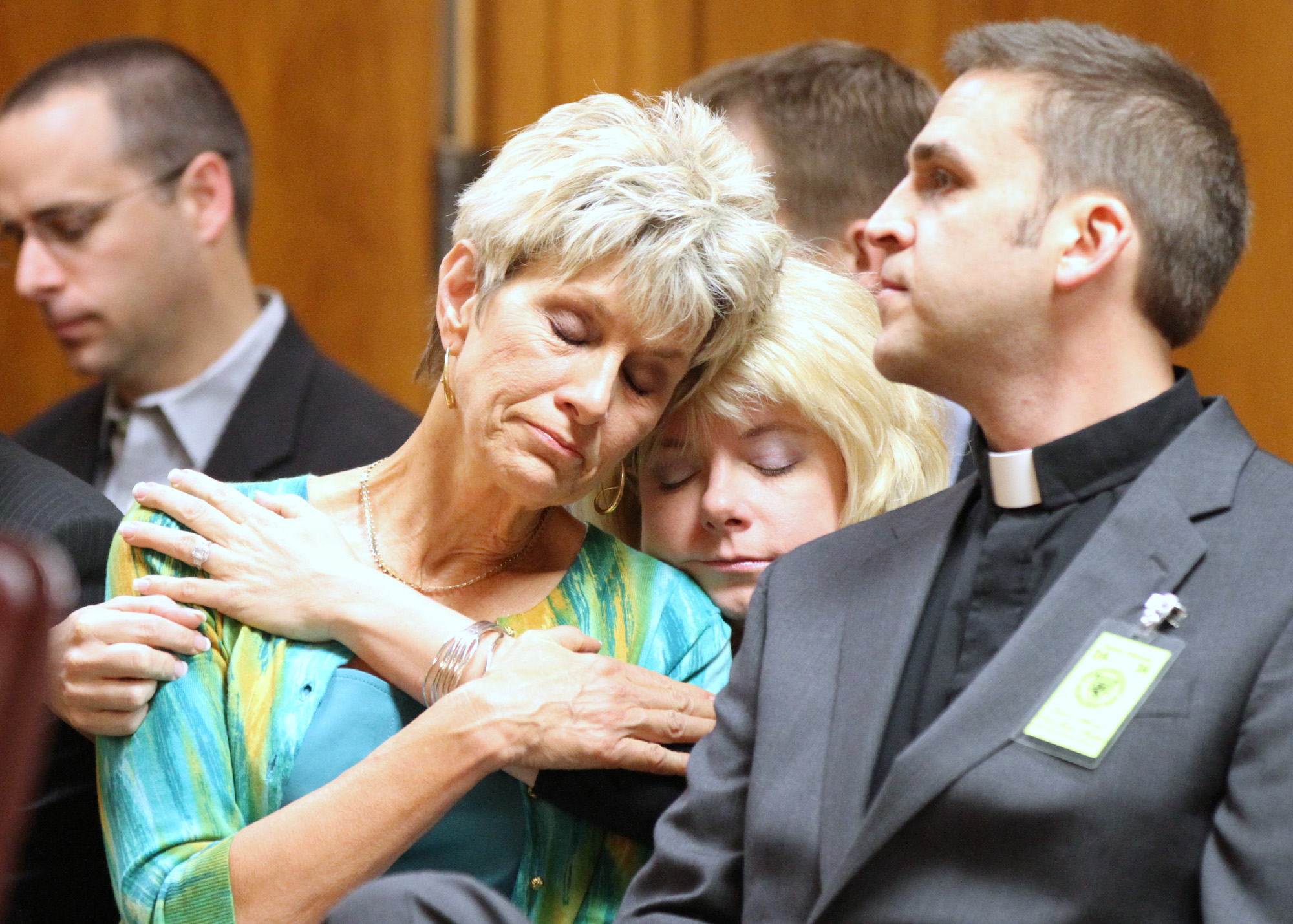 Jeanne Tiller, widow of slain abortion doctor George Tiller, hugs a family member during the sentencing of Scott Roeder in Sedgwick County District Court in Wichita, Kan., Thursday. Roeder was convicted last January of murdering Tiller’s husband, Dr. George Tiller. (AP Photo/Jeff Tuttle, Pool)