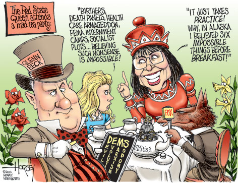 Cartoonist David Horsey takes yet another shot at Sarah Palin and the Tea Bag Party members, but I cannot figure Palin out. She ostensibly cannot name a single newspaper she reads regularly, gets picked out of nowhere to become a Vice-Presidential candidate, loses the election and then quits her job as Alaska’s governor all the while becoming a major celebrity with a huge fan base.