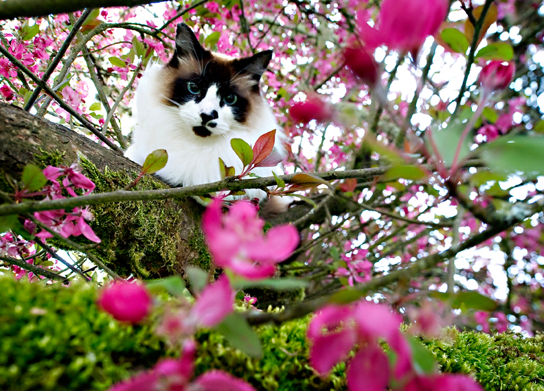 A cat named Leon hangs out in a flowing crabapple tree in Oakland, Ore., this morning. The fruit trees in south western Oregon have mostly blossomed and are starting to leaf out. (Robin Loznak/robinloznak.com)