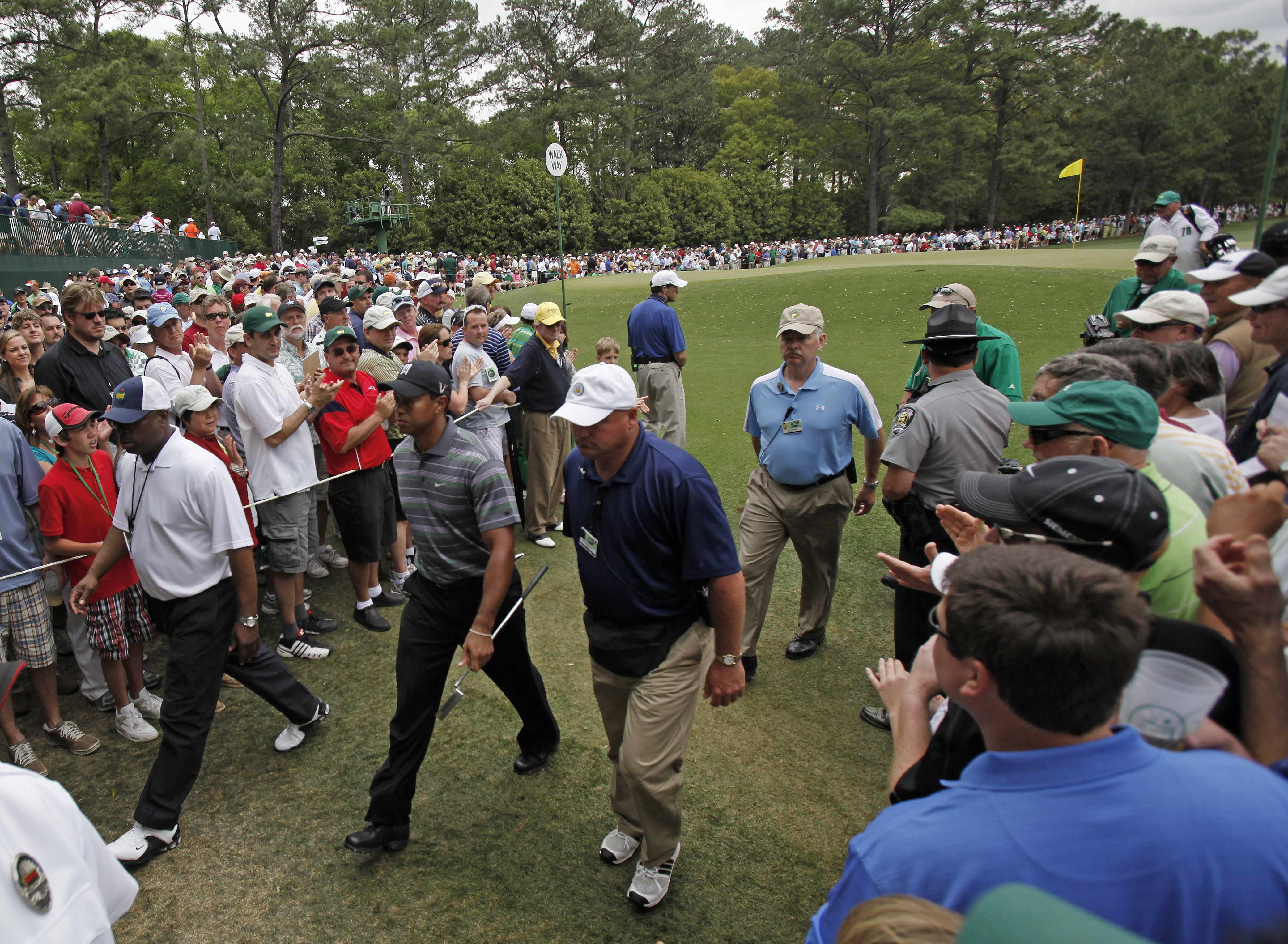 Escorted by security personnel, Tiger Woods walks to the second tee during the first round of the Masters golf tournament in Augusta, Ga., earlier today. Woods shot a 3 under 33 through the first nine holes here . Meanwhile, a heckler in a small plane taunted woods by mocking his attempt to reconnect with his Buddhist faith. A sign trailing he plane said: “Tiger: Did you mean bootyism!” (AP Photo/Rob Carr)