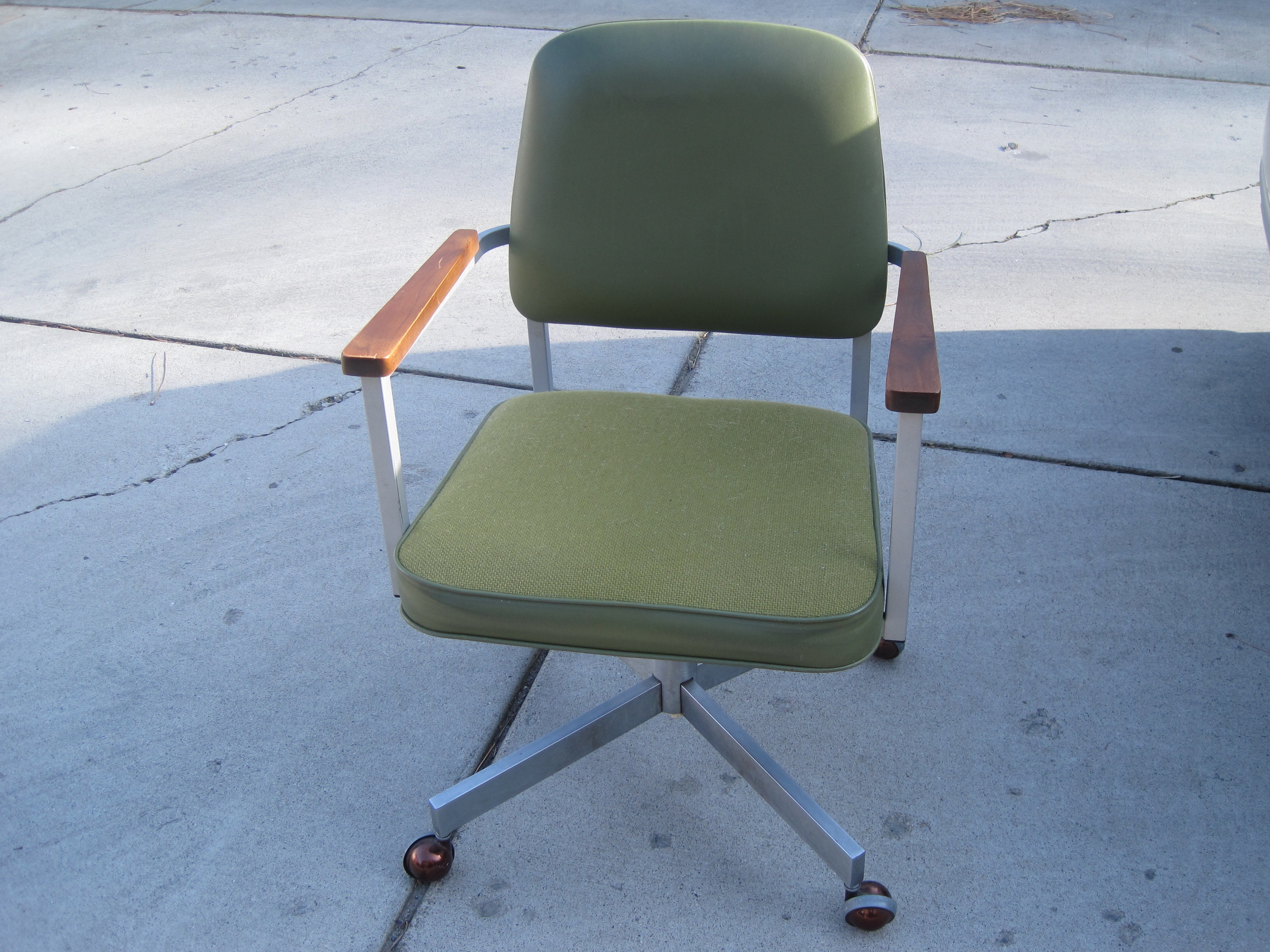 Finally, the man said he would like to get $15 for it. I sat in the chair and liked the way it fit me. There was a good feel to the structure. It rolled easily and tipped back just enough to keep one from feeling like they were sitting in an upright kitchen chair. The fabric seat and naugahyde back were in excellent condition.