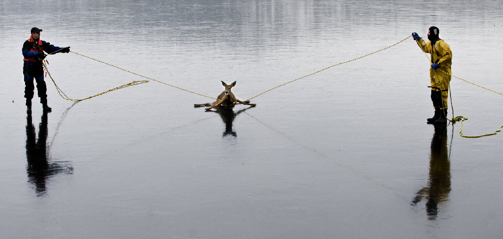 Hauser Lake Fire Protection District Captain Gary Mobbs, left, and Assistant Chief James Neils patiently pull the deer from atop Hauser Lake with a rope. The deer was brought to shore and shortly after the animal returned to the nearby woods Tuesday morning. (Special to the SR: Brian Plonka)