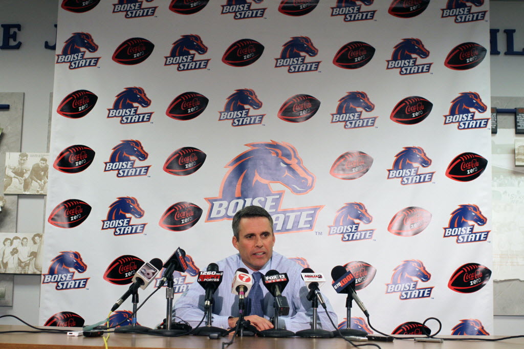 Boise State head coach Chris Petersen answers questions for the media at a news conference on Sunday in Boise where it was announced that Boise State would be accepting an invitation to play Utah in the Maaco Las Vegas Bowl on Dec. 22. (AP Photo/Idaho Press-Tribune, Charlie Litchfield)