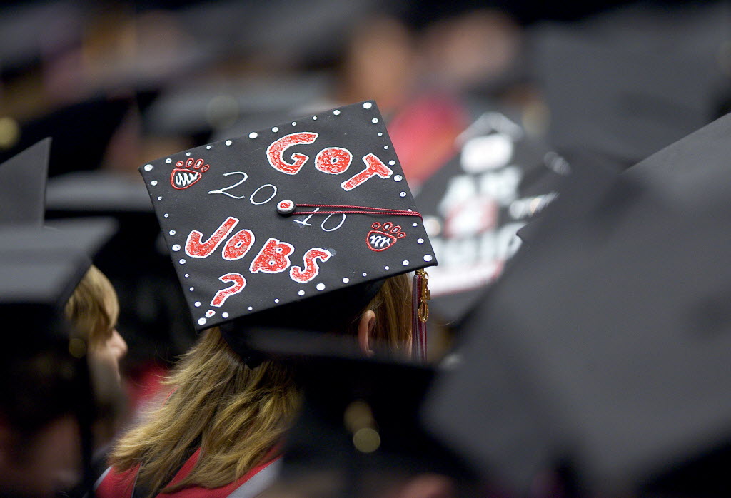 The self-decorated cap worn by Haley Lampman, 23, of Tacoma, Wash., asks a question facing many graduates who participated in the Washington State University Fall 2010 Commencement at Beasley at Beasley Coliseum in Pullman, Wash. Lampman earned a degree in creative writing. (AP Photo/Moscow-Pullman Daily News, Dean Hare)