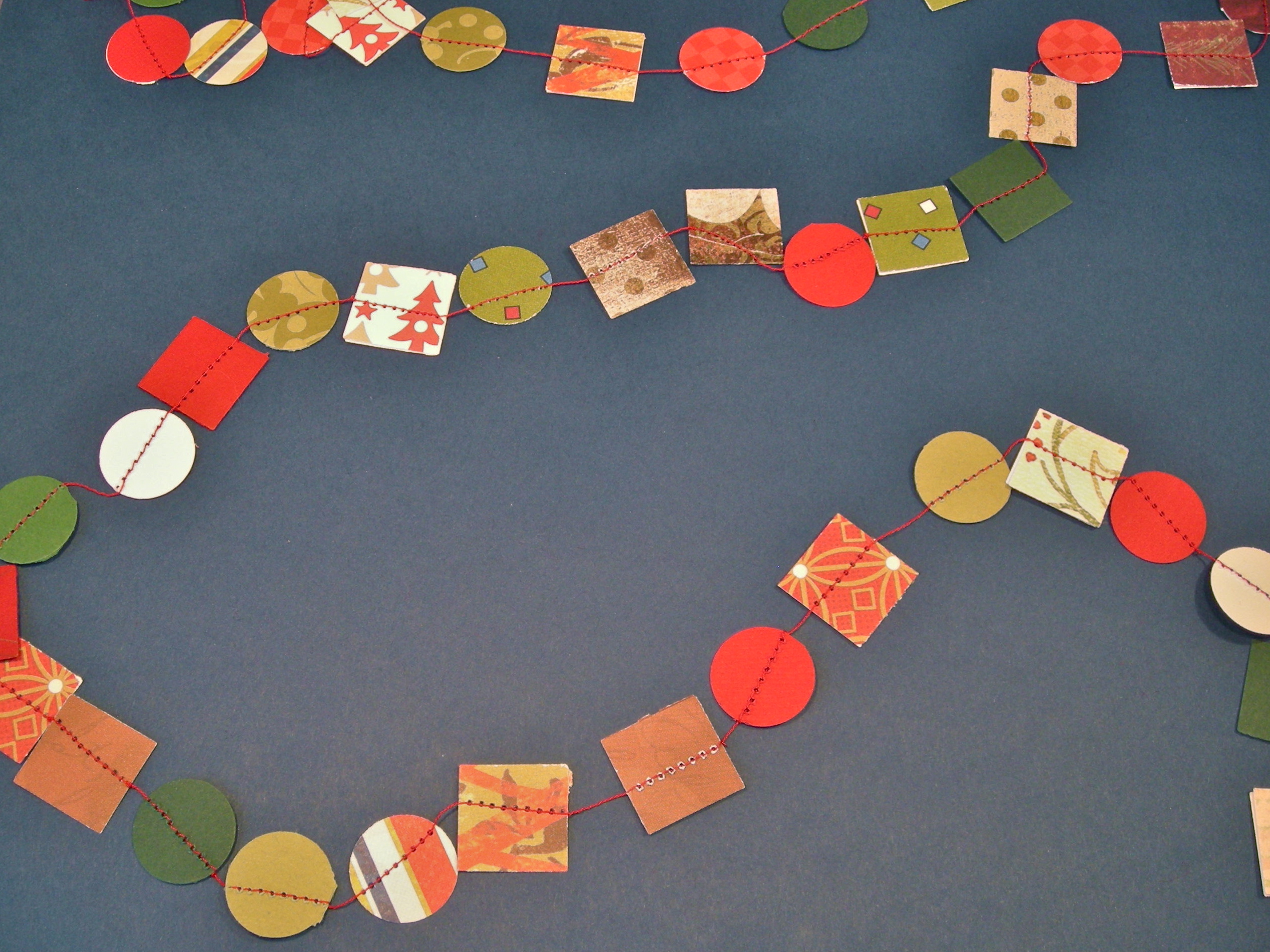 This is another simple garland that looks just as good hanging on a tree as is does simply placed among decorations on the mantle. It is very simple to make and recycles paper scraps from other projects!