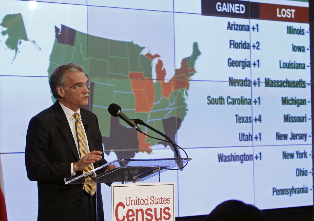 Census Bureau Director Robert Groves announces results for the 2010 U.S. Census at the National Press Club earlier today in Washington. The census shows slowing U.S. growth, and more House seats for GOP-leaning states. Story here . Also: Idaho population grew 21.1%, easily outpacing the national average of 9.7%, here . (AP Photo/Jacquelyn Martin)