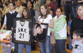 and the coaching staff. The Rose Creek Drummers did an Honor Song before Stensgar spoke of Tim Wolfe and what a remarkable young man he was. Tim Clark, AISA vice president and longtime friend of Wolfe’s, spearheaded efforts to contact the family and get Wolfe’s picture and jersey to display. That jersey, No. 21, had been retired by SKC at an earlier ceremony. The coaching staff contacted the Shooting Star Dancers, a dance group from the reservation, and they performed in honor of Wolfe.
