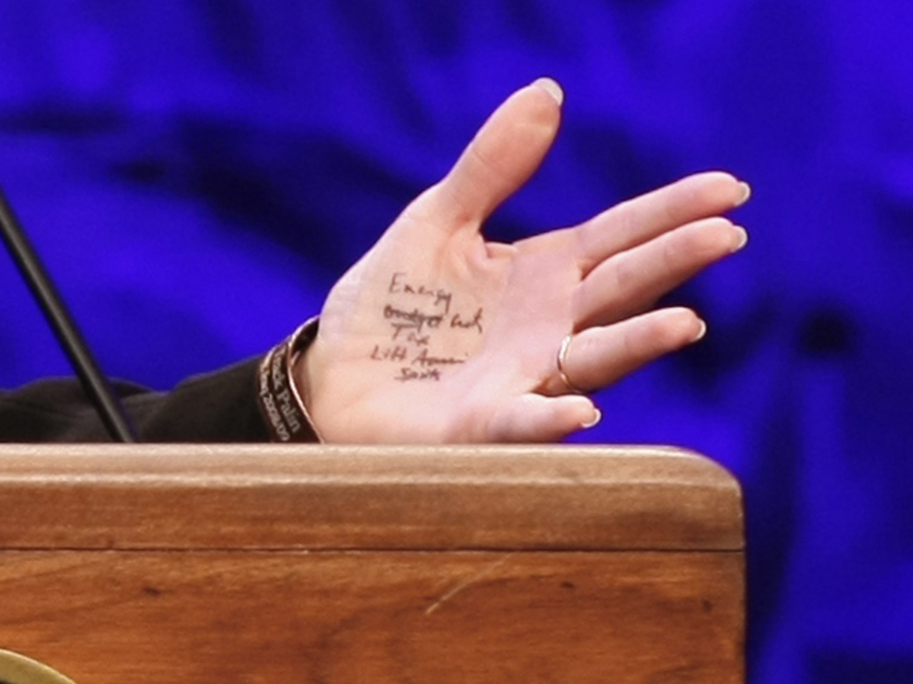 Former vice presidential candidate Sarah Palin addresses attendees at the National Tea Party Convention in Nashville on Saturday. On her hand appears to be handwritten notes. (AP Photo/Ed Reinke)
