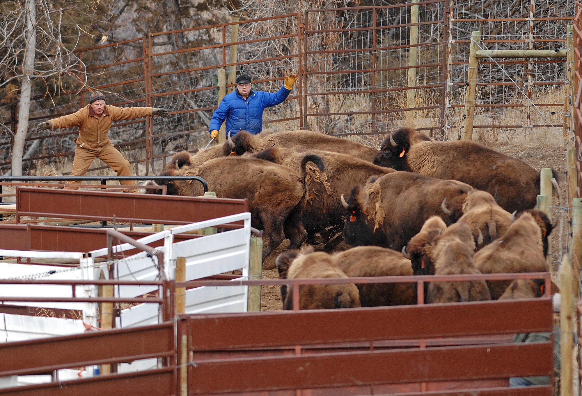 Wranglers corral bison into livestock trailers at the Slip and Slide containment facility in Corwin Springs, Mont., on Wednesday in preparation for travel to Ted Turner’s Green Ranch along the Madison River west of Bozeman, Mont. The bison, which have tested brucellosis-free, will be kept on the ranch for the next five years as part of a bison quarantine study. Bozeman Chronicle story here . (AP Photo/The Bozeman Daily Chronicle, Sean Sperry)