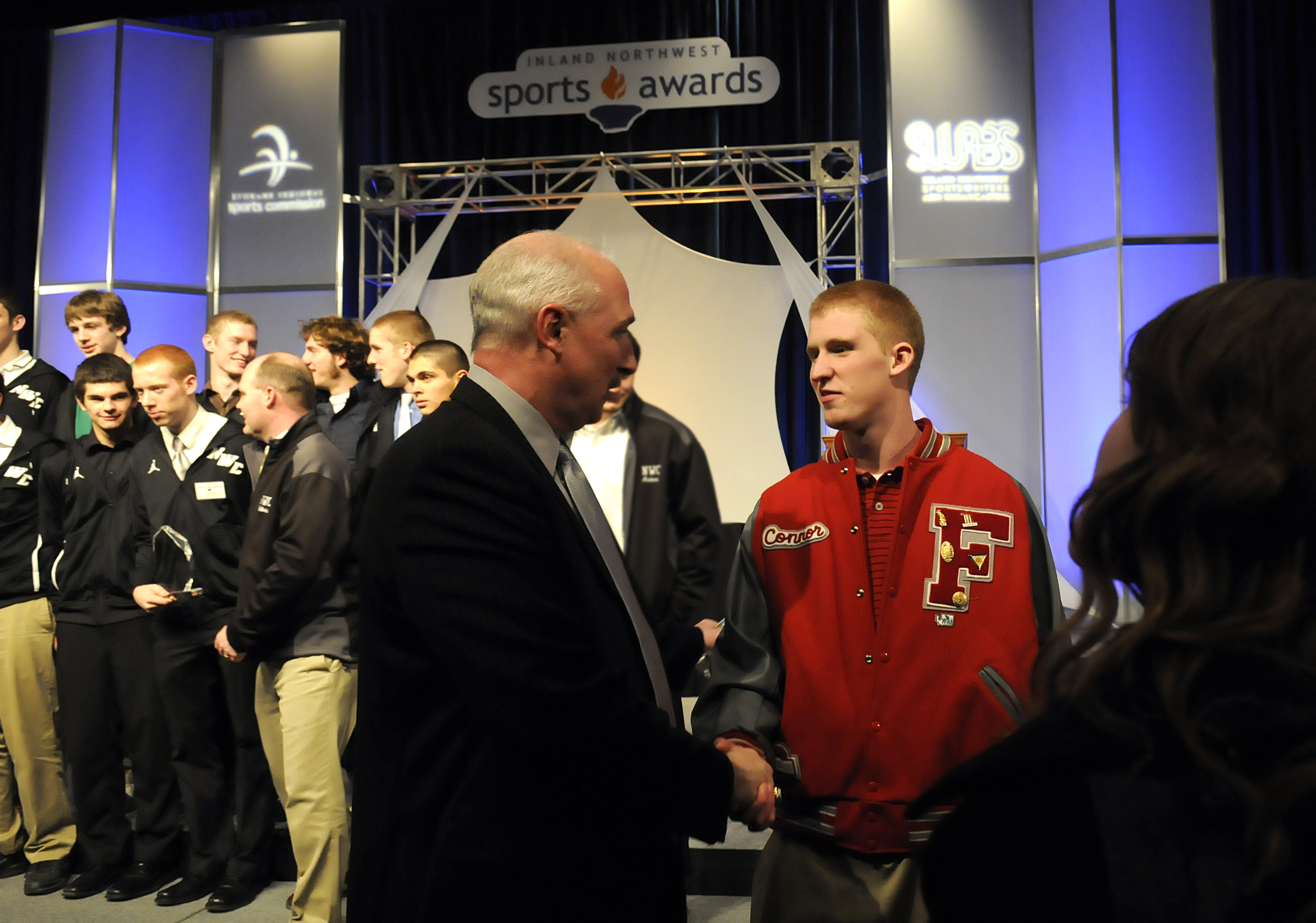 Idaho Coach Robb Akey, center, shakes hands with Ferris’ Connor Halliday, right, at the end of the annual Inland Northwest Sports Awards luncheon Wednesday at the Spokane Convention Center. Greg Lee story here . Also: See Mike Vlahovich story below. (Jesse Tinsley/SR)