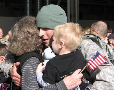 Coeur d’Alene Police Department Officer Shane Avriett/Air Force Tech. Sergeant Avriett arrived home safely at Fairchild AFB today after a 6 month deployment with his Air Force Reserve unit in Iraq. More Coeur d’Alene Today photos here and here .