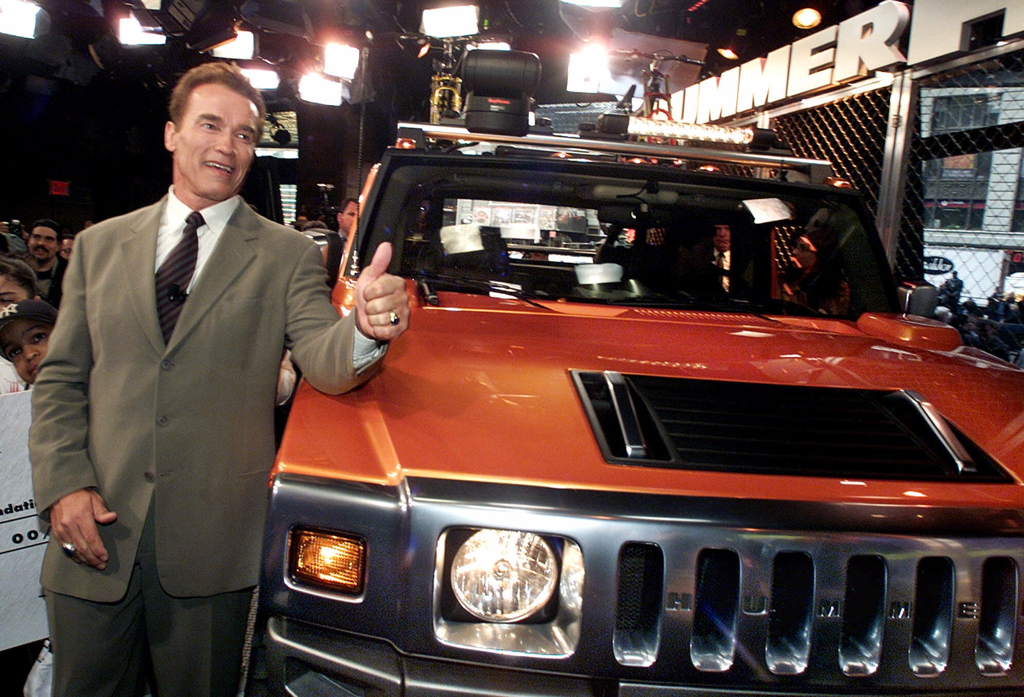 In this April 10, 2001, file photo, Arnold Schwarzenegger poses with a 2001 concept Hummer H2 at the utility vehicle’s unveiling in New York’s Times Square. The Hummer, the beefy, military-inspired SUV _ a macho icon for fans like Schwarzenegger and a symbol of ruin for environmentalists _ was done in by high gas prices and bad economic times. Unless a last-minute buyer steps forward, Hummer is going the way of Saturn and Pontiac. (AP Photo/Richard Drew, File)