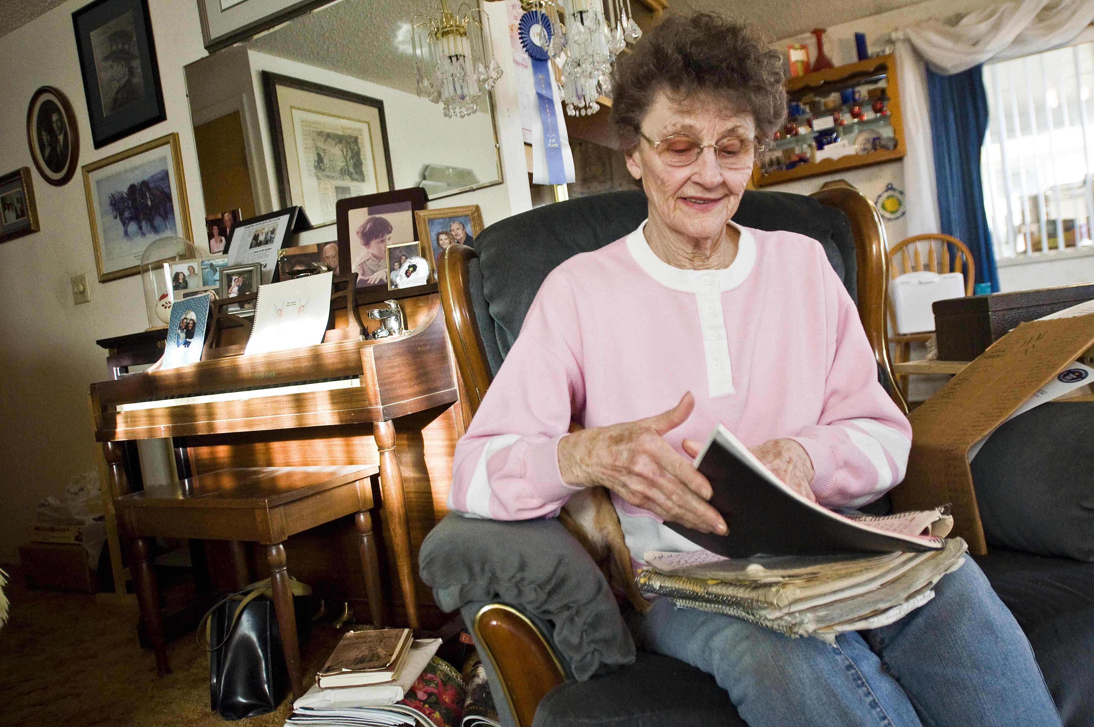 Darlyne Markus flips through past payment books in the living room of her Nampa, Idaho home on Thursday. Markus was recognized by the Guinness World Records as the world’s longest serving paper girl for her 50 years of service to the Idaho Press-Tribune. Idaho Press Tribune story by Sharon Strauss here . (AP Photo/Idaho Press-Tribune, Charlie Litchfield)