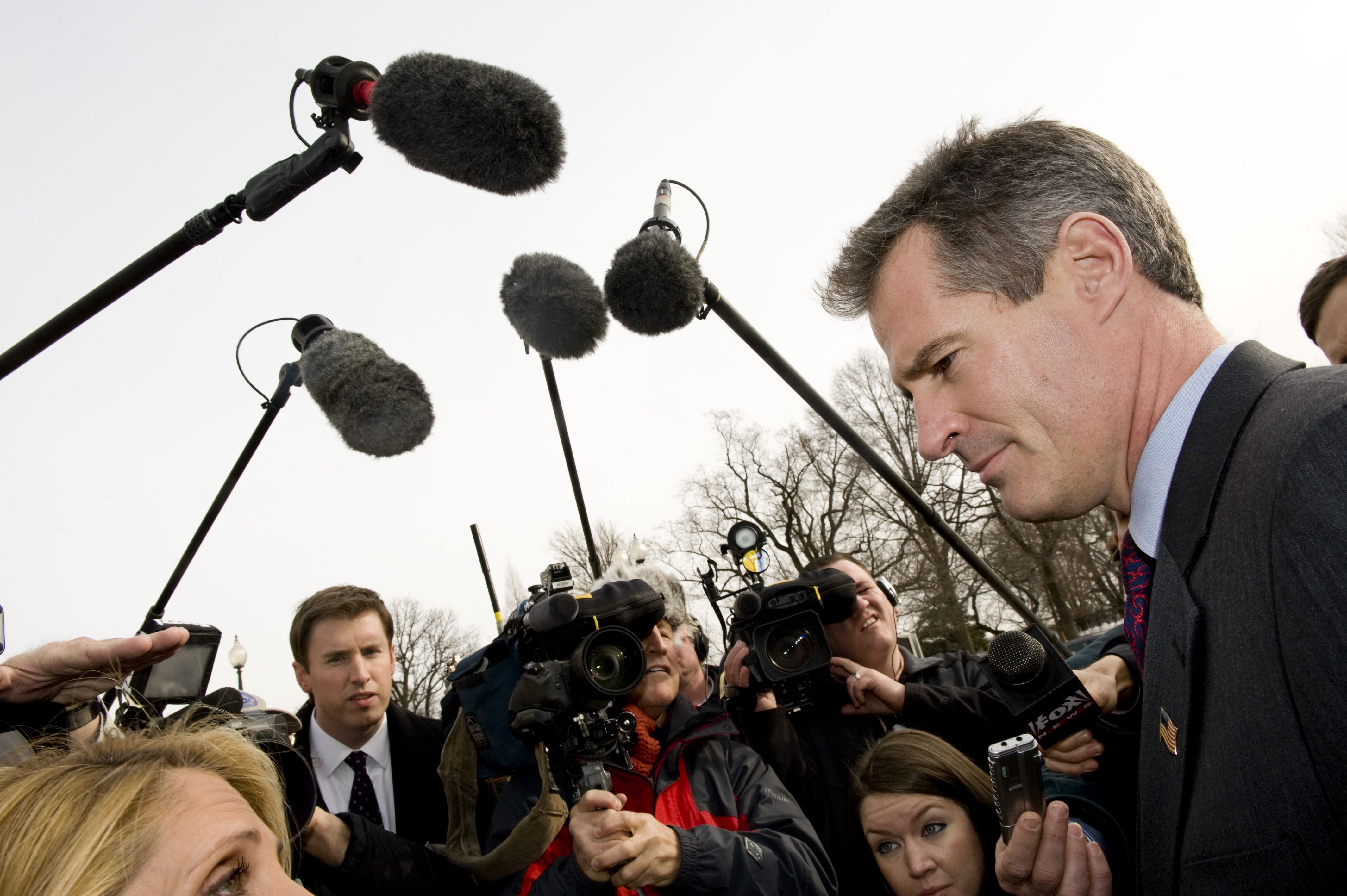 Sen.-elect Scott Brown, R-Mass. speaks with reporters after arriving on Capitol Hill in Washington Thursday. Election results were certified this morning, paving the way for Brown to takes the oath of office and officially replace the late Dem icon Teddy Kennedy this evening. Boston Globe report here . (AP Photo/Cliff Owen)