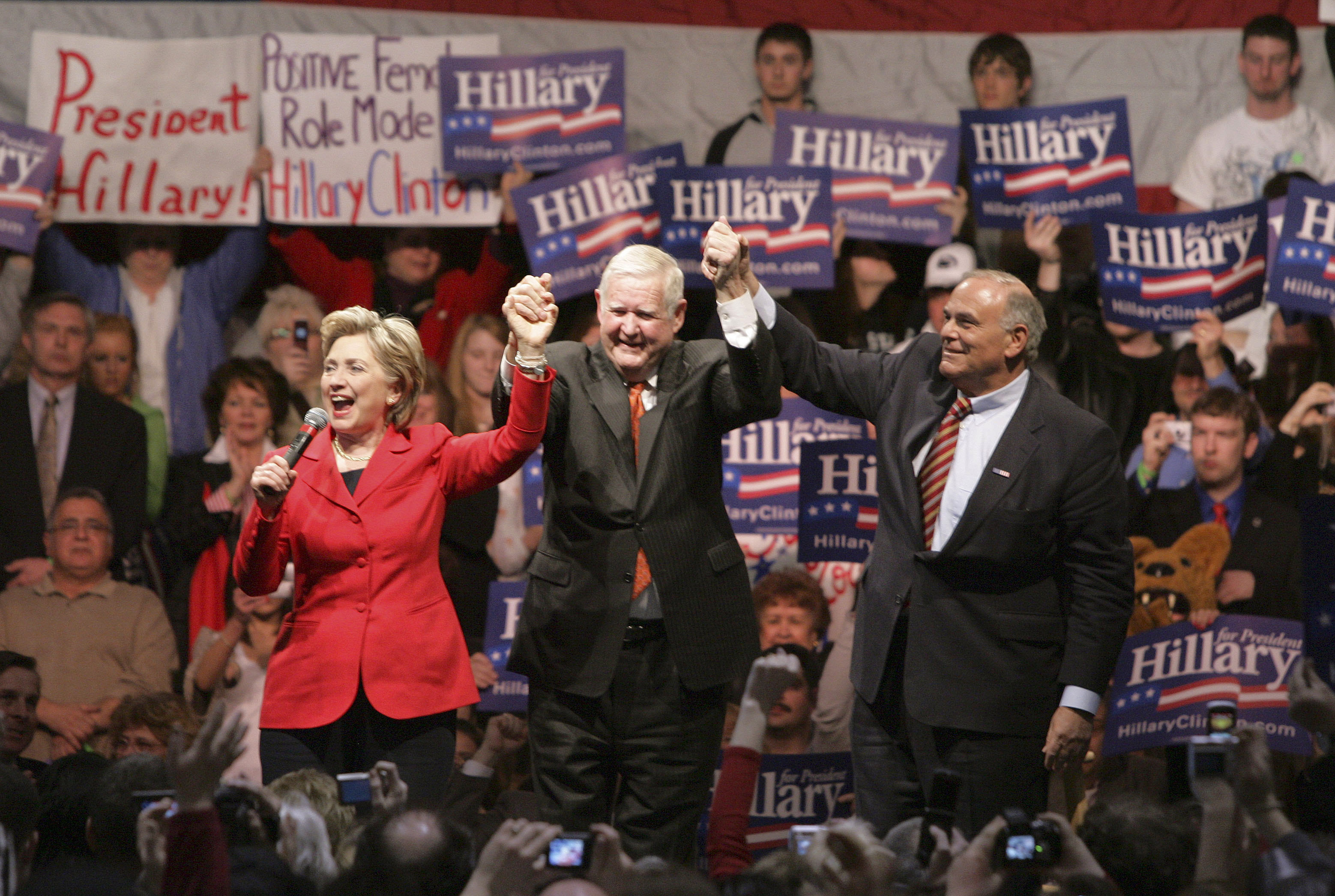 In this March 24, 2008, file photo, Democratic presidential hopeful Sen. Hillary Rodham Clinton, D- N.Y, left, addresses the crowd with Rep. John Murtha, D-Pa., center, and Pennsylvania Gov. Ed Rendell at the Fayette Campus of Penn State University in Uniontown, Pa. Murtha, an influential critic of the Iraq War whose congressional career was shadowed by questions about his ethics, died today. He was 77. AP story here . (AP Photo/Keith Srakocic, File)