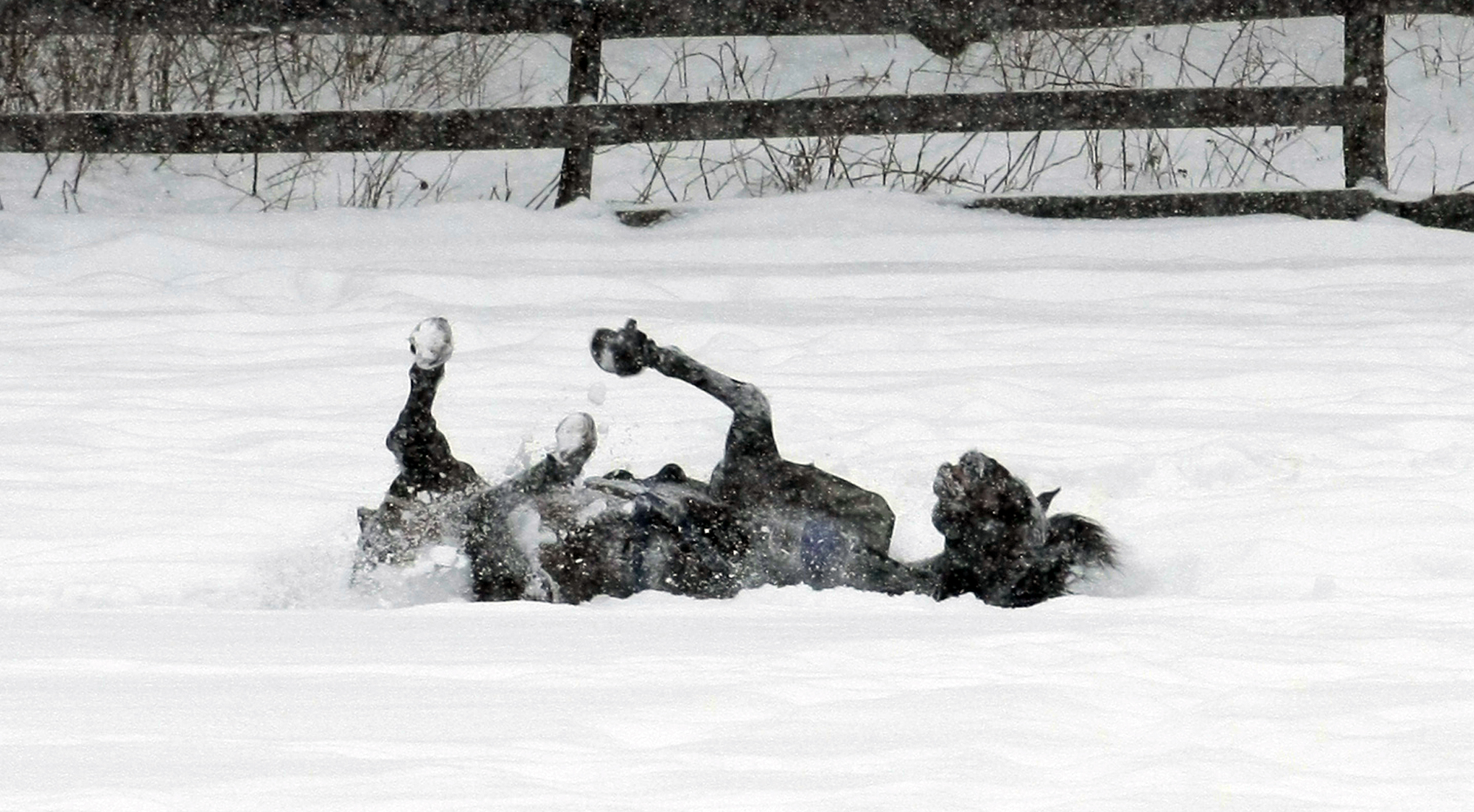 A horse rolls around in the snow Tuesday in Gates Mills, Ohio. Forecasters say snow will continue to fall on parts of northeast Ohio that already have two feet or more on the ground. (AP Photo/Tony Dejak)
