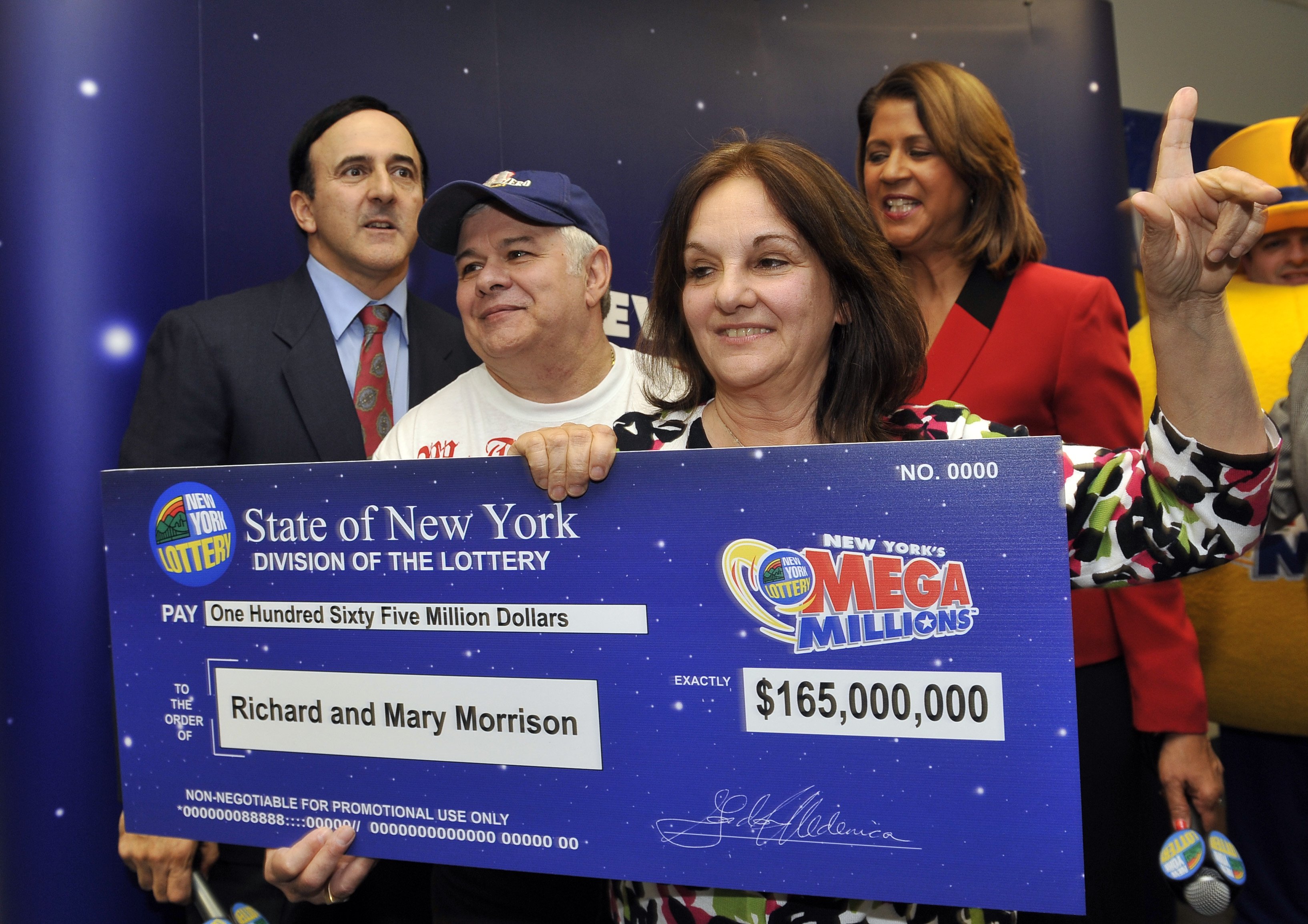 With her husband Richard by her side, Mega Millions Winner Mary Morrison of Miller Place, N.Y. flashes the number one sign after they were presented with their ceremonial check for $165,000,000 by New York Lottery jackpot announcer Ralph Buckley and the Lottery’s Yoland Vega at the New York Lottery Customer Service Center today in Garden City, N.Y. (AP Photo/Kathy Kmonicek)