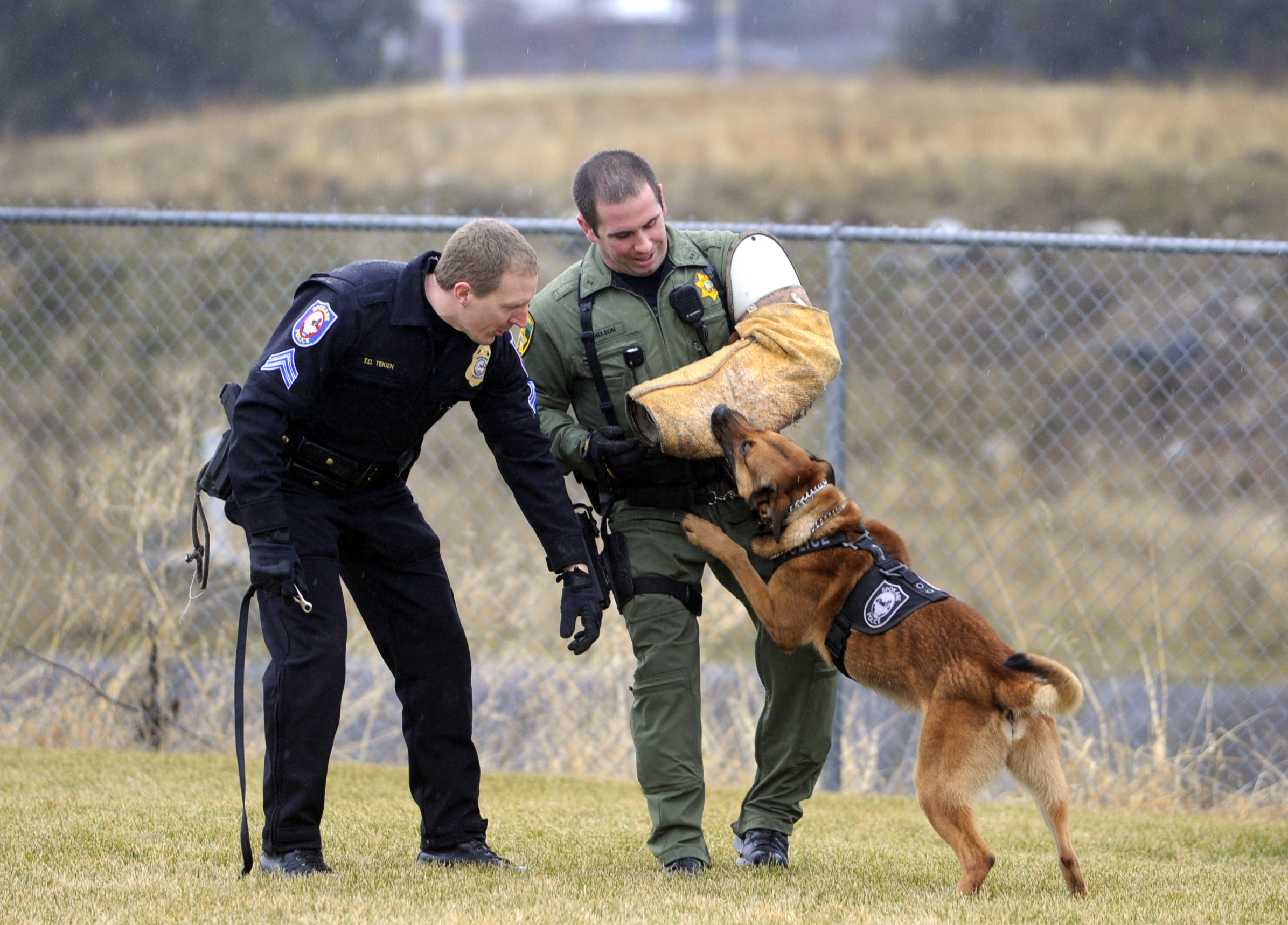 The 3-year-old Belgian Malinois (left) grabbed the pad-covered arm of the provoking deputy and didn’t let go. He was demonstrating today at the Spokane Police training center in honor of his graduation from K-9 school.