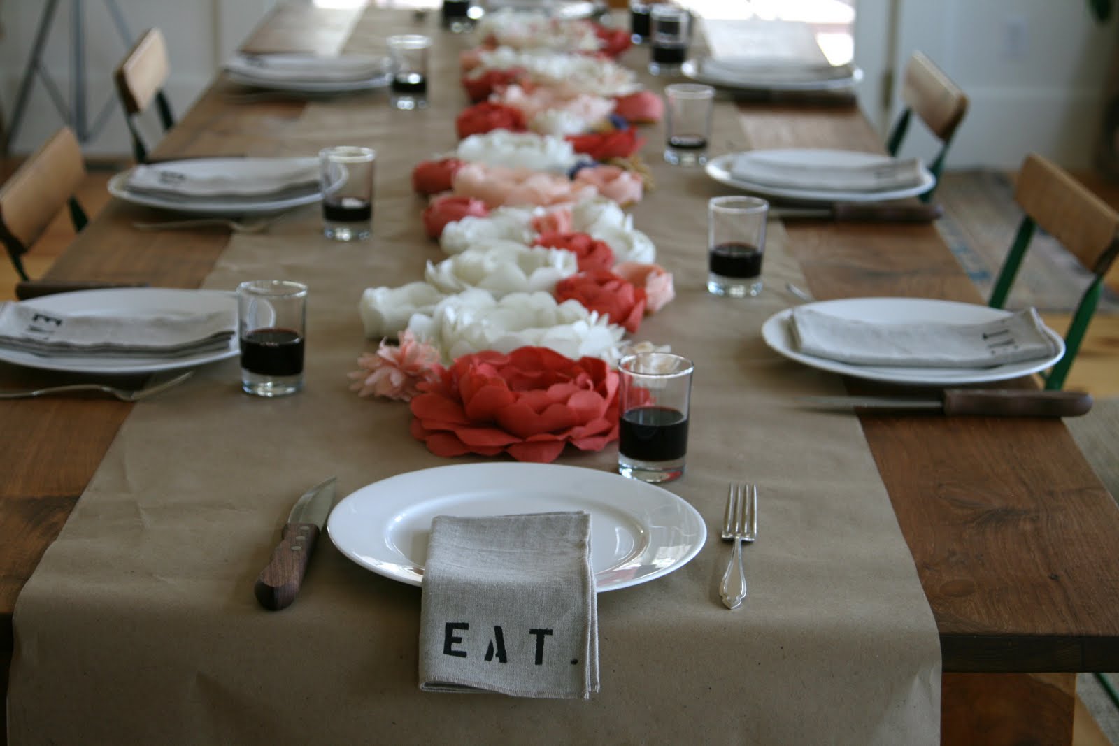 , a fabric flower business back east run by a husband and wife who look like they’ve been ripped out of the pages of a J. Crew catalog. Emerson Made also designs and sells some clothes and other sewn stuff, like dinner napkins. Their table setting (see photo above) makes me want to throw a dinner party, not to mention sand and restain my dining room table, make 100 fabric flowers and drink my wine from juice glasses.