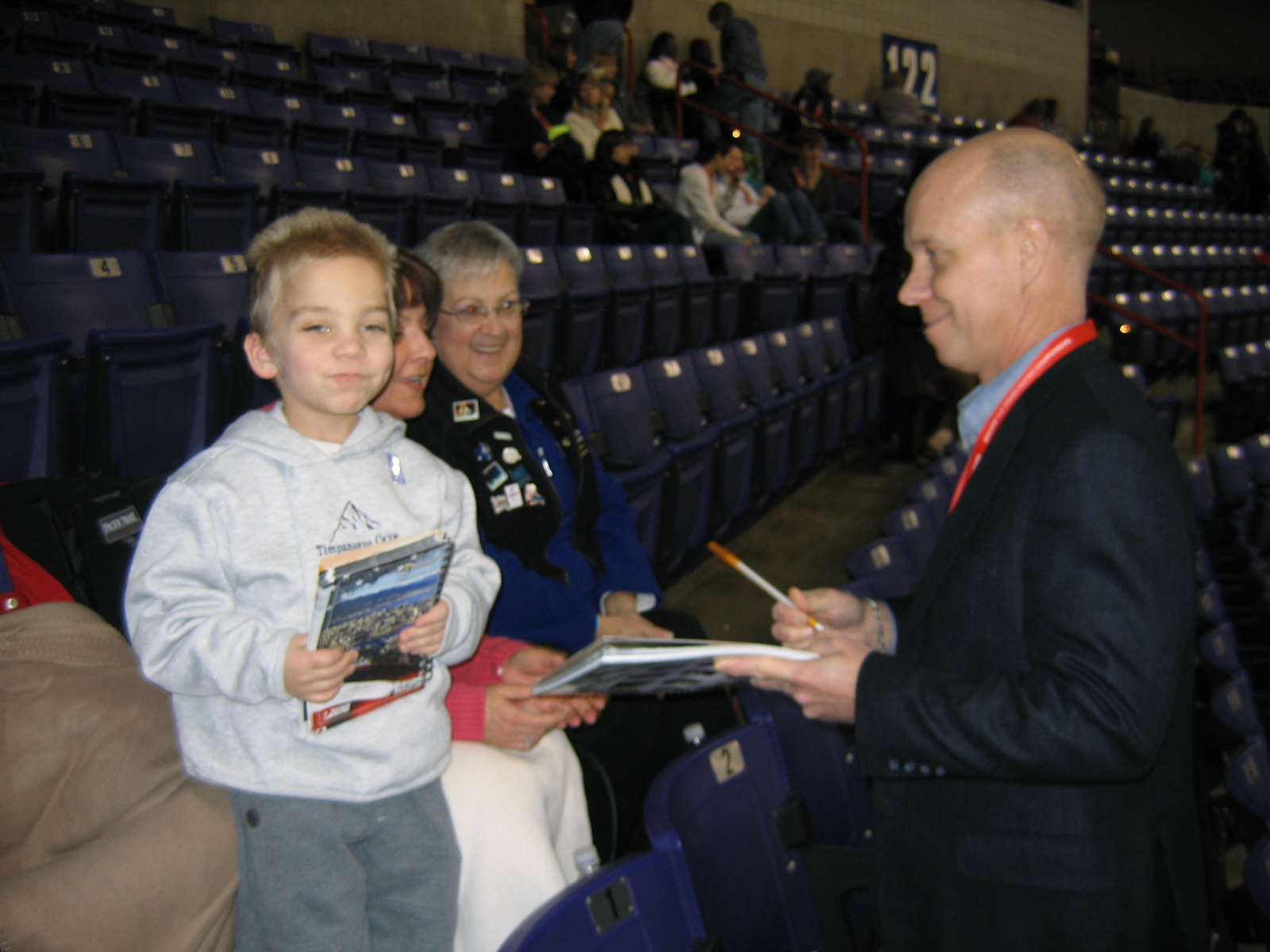 Scott Hamilton, skating star turned skating commentator, is at the Arena in a visible way. During the slow times, he often walks through the stands, chatting with people.