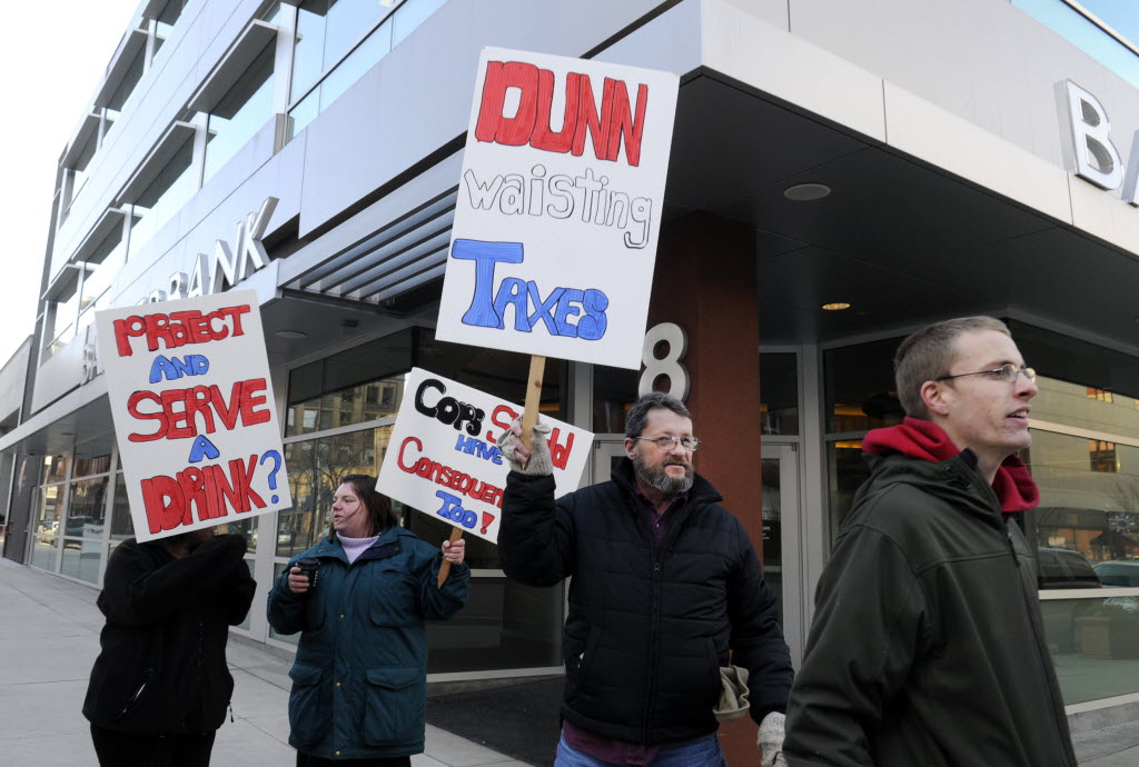 A handful of citizens (pictured above) protested the lawsuit outside his downtown Spokane office today.