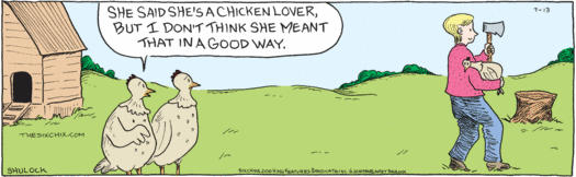 This cartoon expresses my feeling re: chickens. I can’t believe Coeur d’Alene City Council is considering allowing residents to raise an unlimited number of chickens.