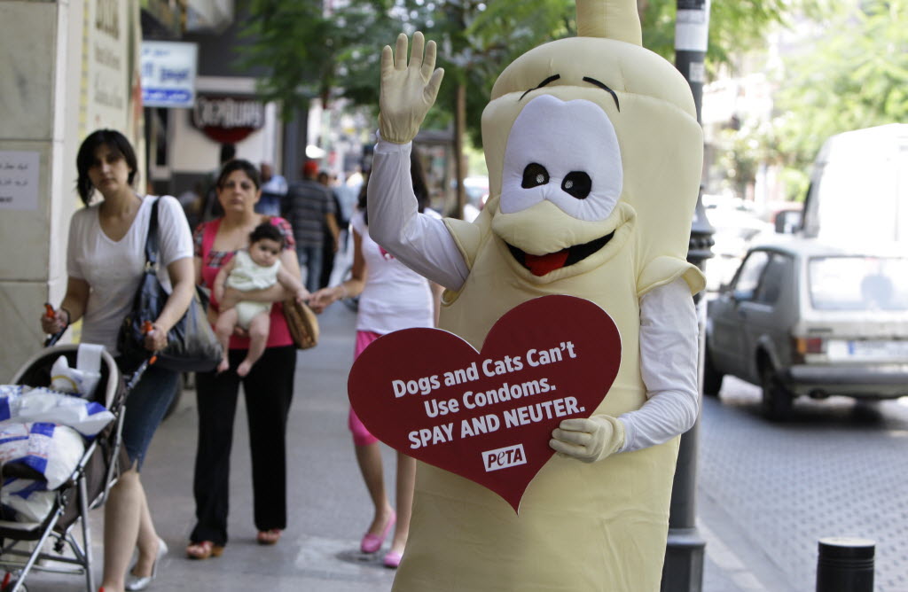 A member from PETA, people for the ethical treatment of animals, dressed as a giant condom, promotes animal birth control in Beirut, Lebanon, earlier today. You write the cutline. (AP Photo/Bilal Hussein)