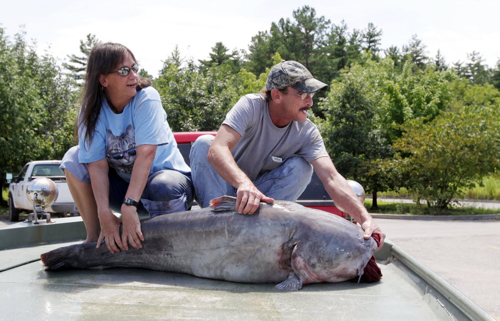 Greg Bernal, 47, of Florissant, right, and Janet Momphard, 47, of St. Charles, pose for a picture with the 130-pound blue catfish Bernal pulled in at 12:45 a.m. Tuesday on the Missouri River. STLtoday.com, the website for the St. Louis Post-Dispatch, reported it appears to be a state record, topping a 117-pound catfish caught on a trotline in the Osage River in 1964. Bernal said he fought the fish for 15 minutes and spent another half-hour lifting it into his boat near the Columbia Bottom Conservation Area. (AP Photo/St. Louis Post Dispatch, Stephanie S. Cordle)
